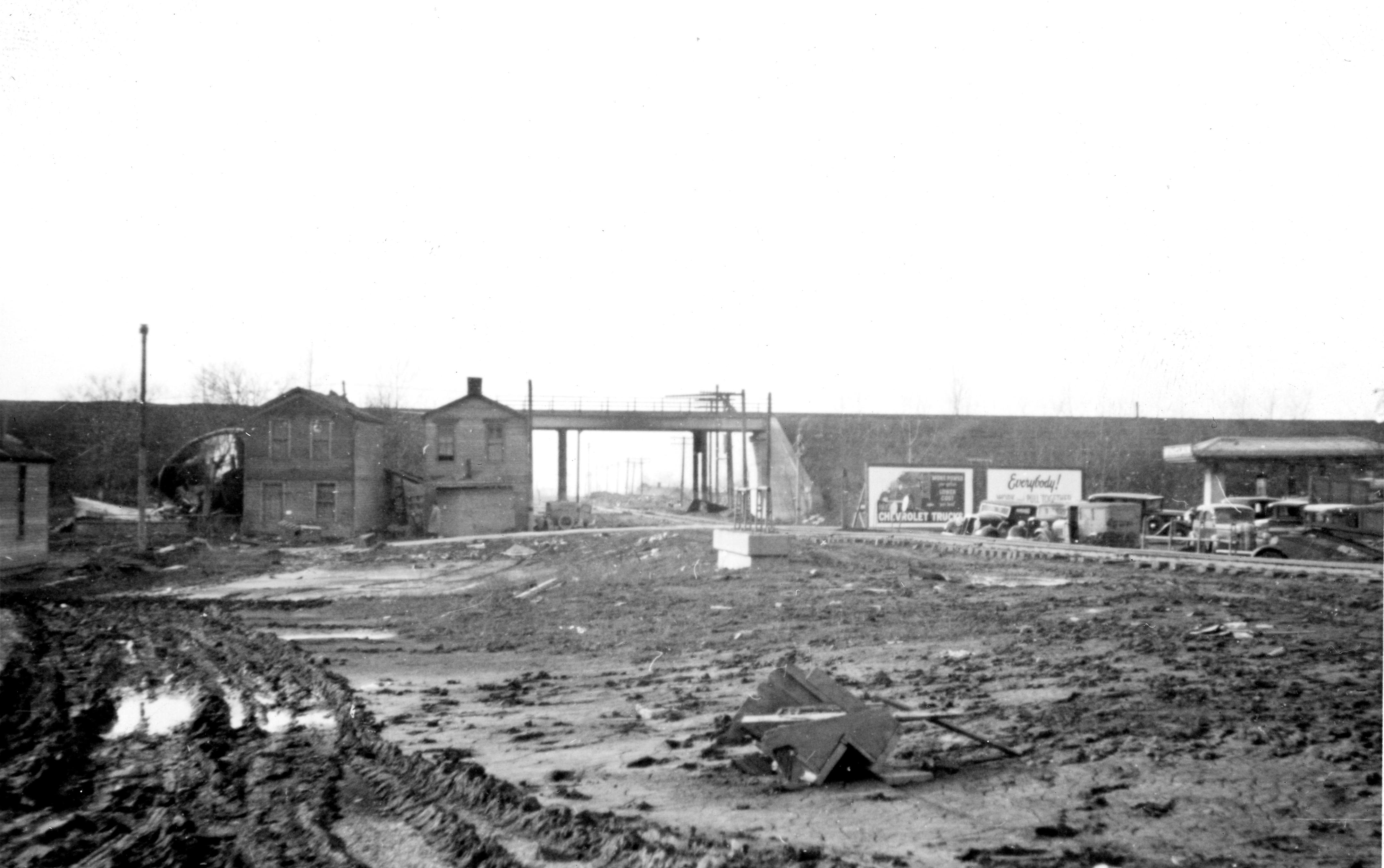 Large area of muddy ground with tire track in foreground, with overpass in rear. Two frame buildings in front of overpass. Many cars around filling station on right. Large piece of flood debris in foreground.
