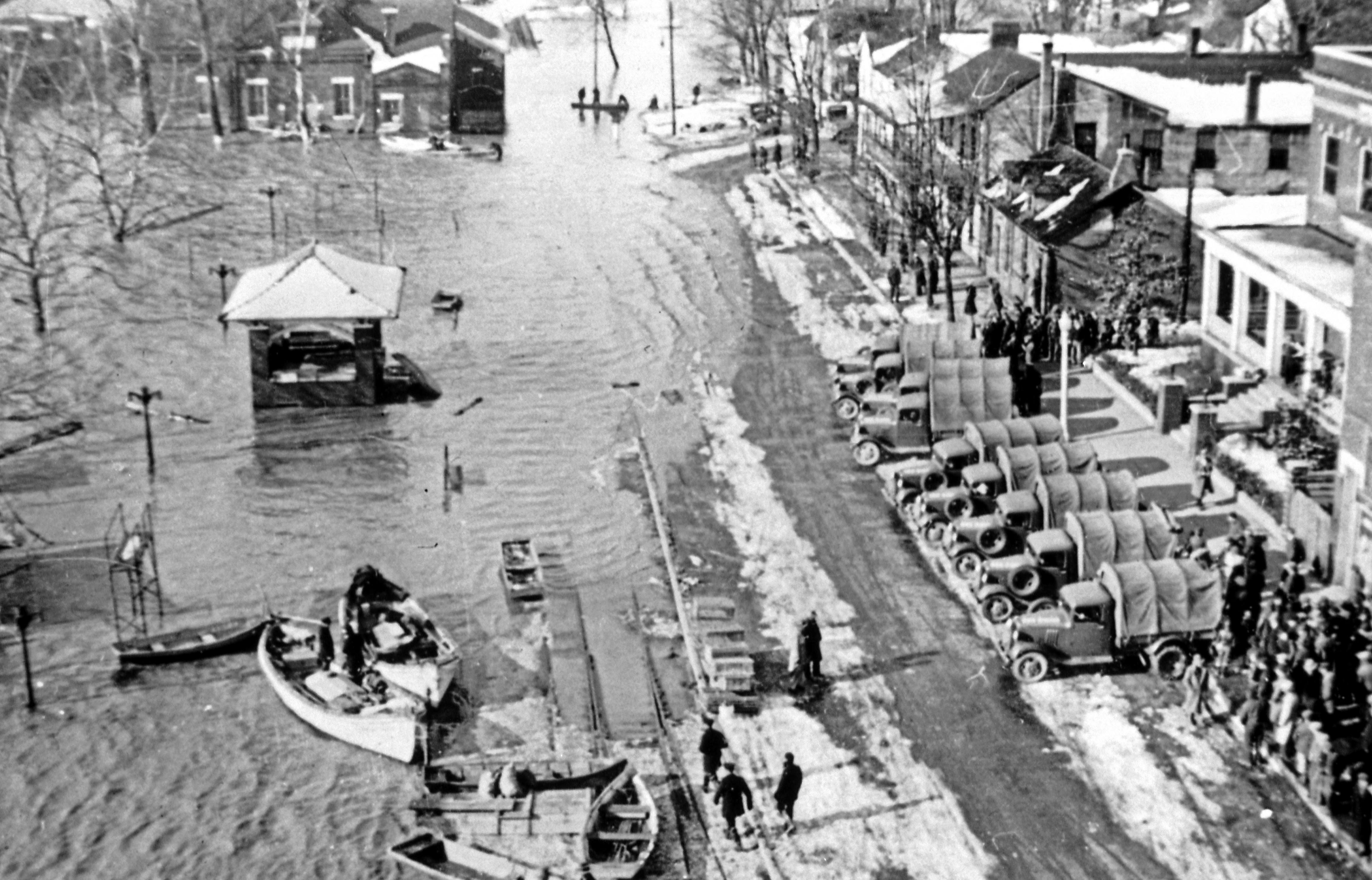 Sherburne Park at 151 W. Water St., Mt Vernon, IN bandstand in middle of picture. Trucks lined up on shore to right with crowds nearby. Rowboats and rescue boats in left foreground.