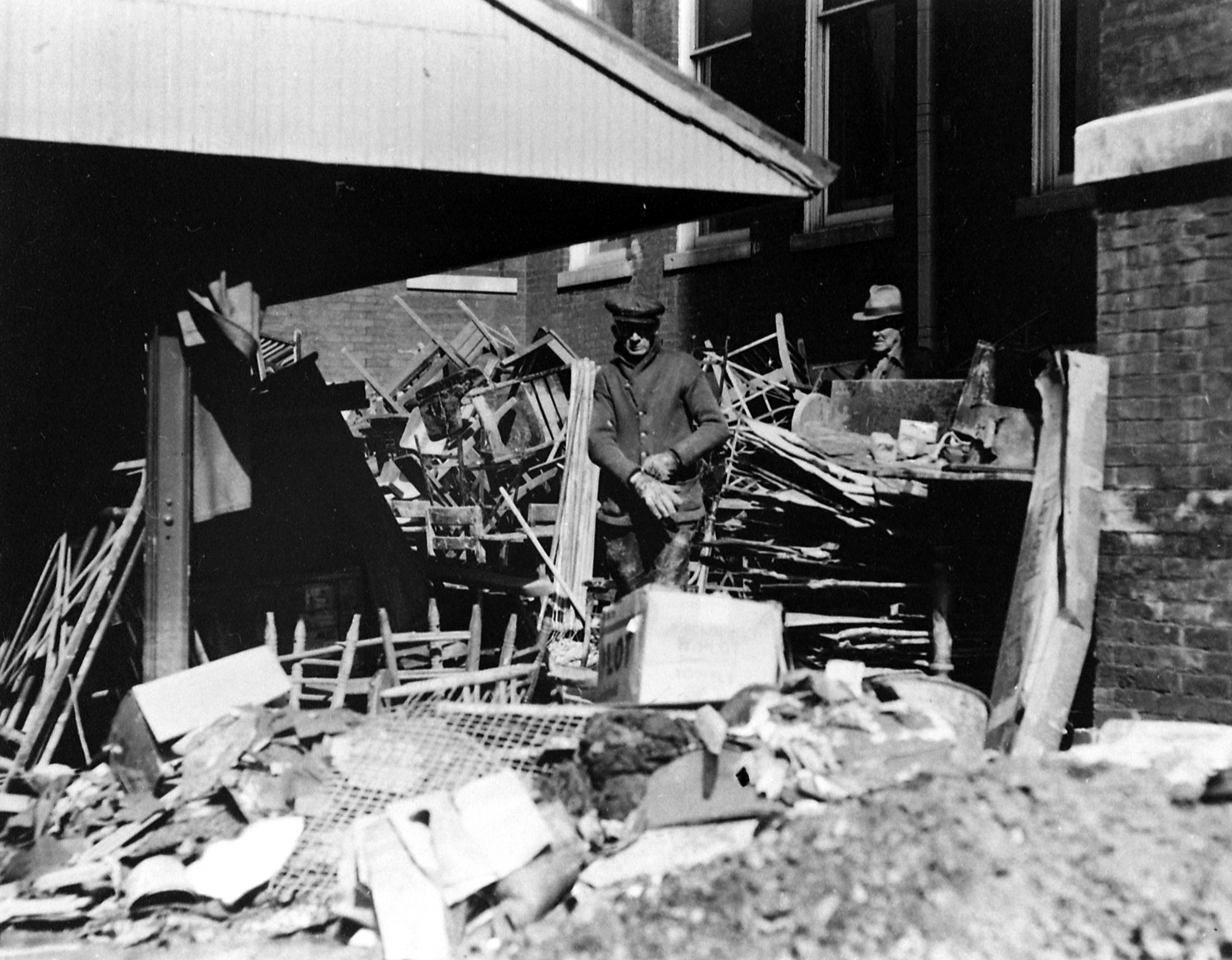 Two men standing in damage at Central High School at 215 NW 6th St., possibly getting ready to clear it
