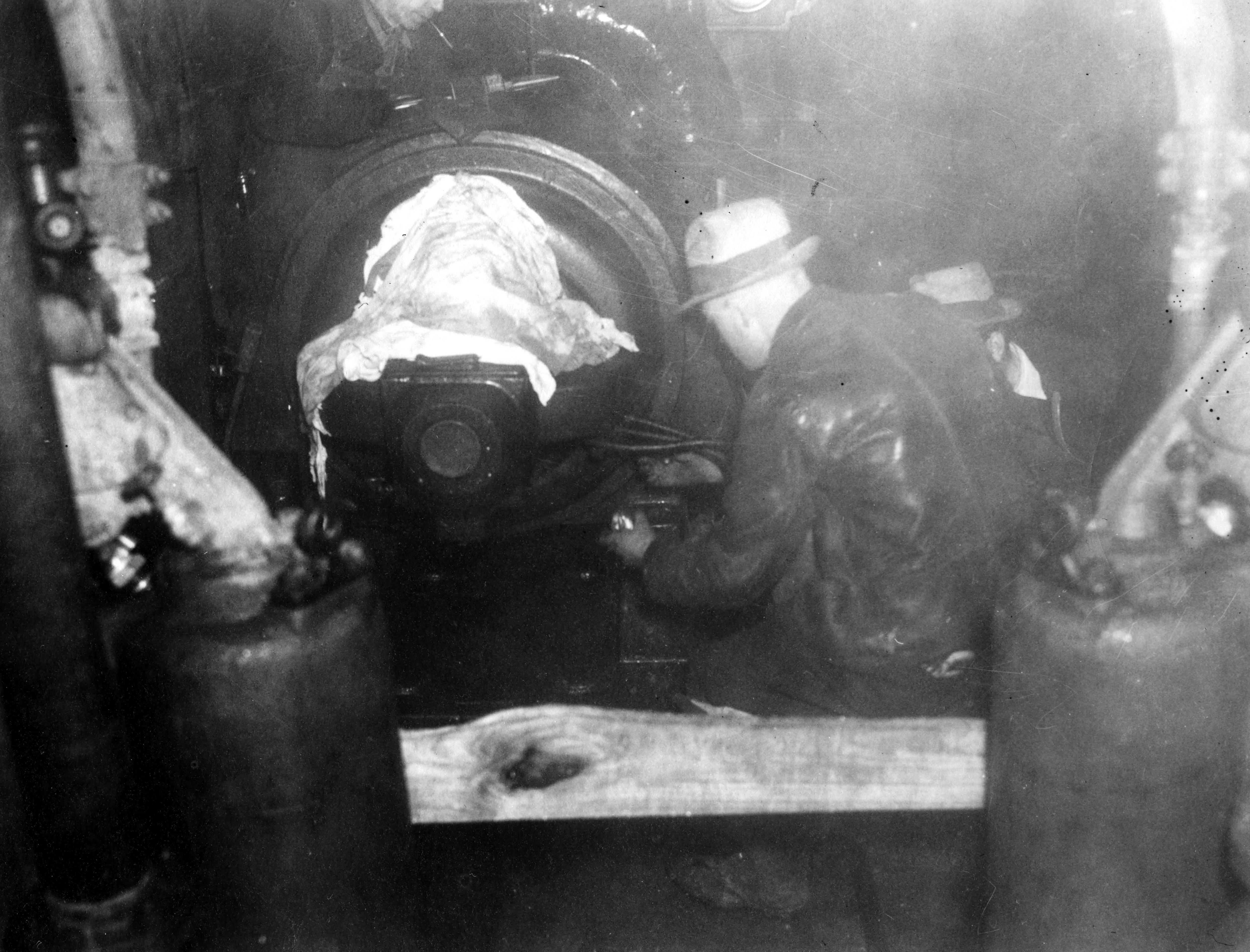 Close-up of two men working to repair Water Works 60 ft. down. The Evansville City Water Works Dept. was at 400 NW Riverside Dr.