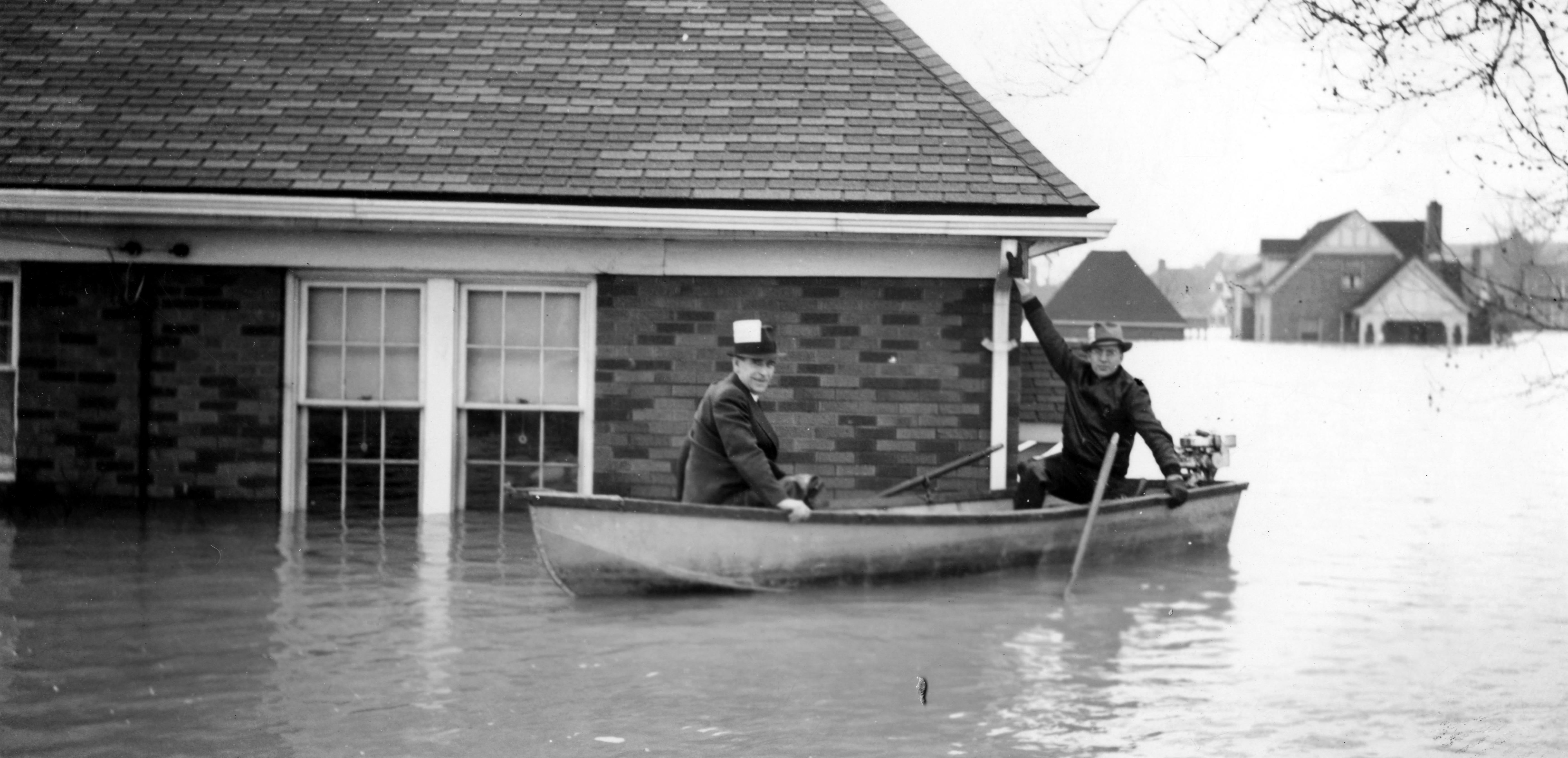 Two men in motorboat right by a brick house, with man on right touching top of drain spout
