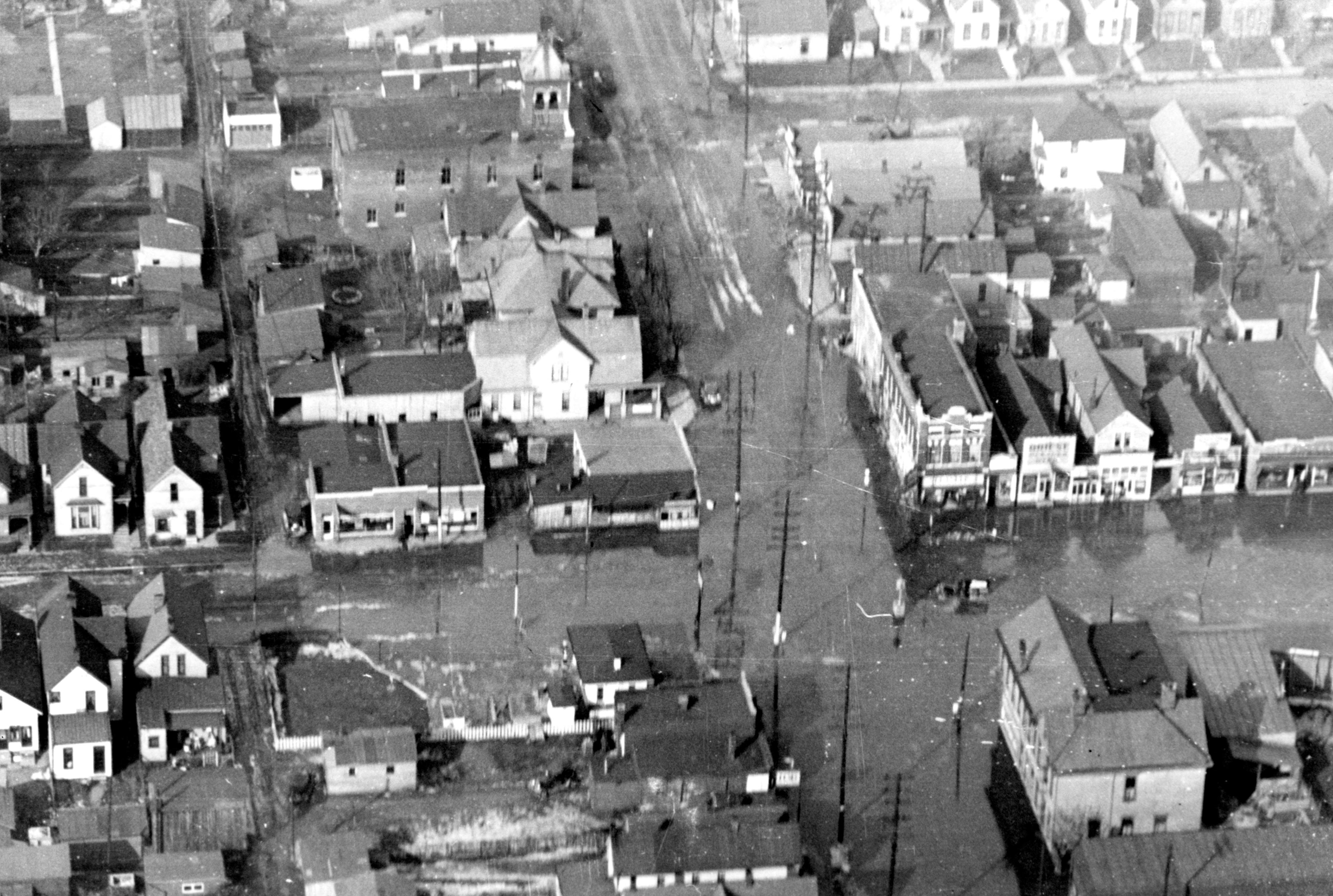 Aerial view of the intersection of W. Franklin St. and St. Joseph Ave. Brick building just to the right of center is Franklin Drug Store at 2339-41 W. Franklin.
