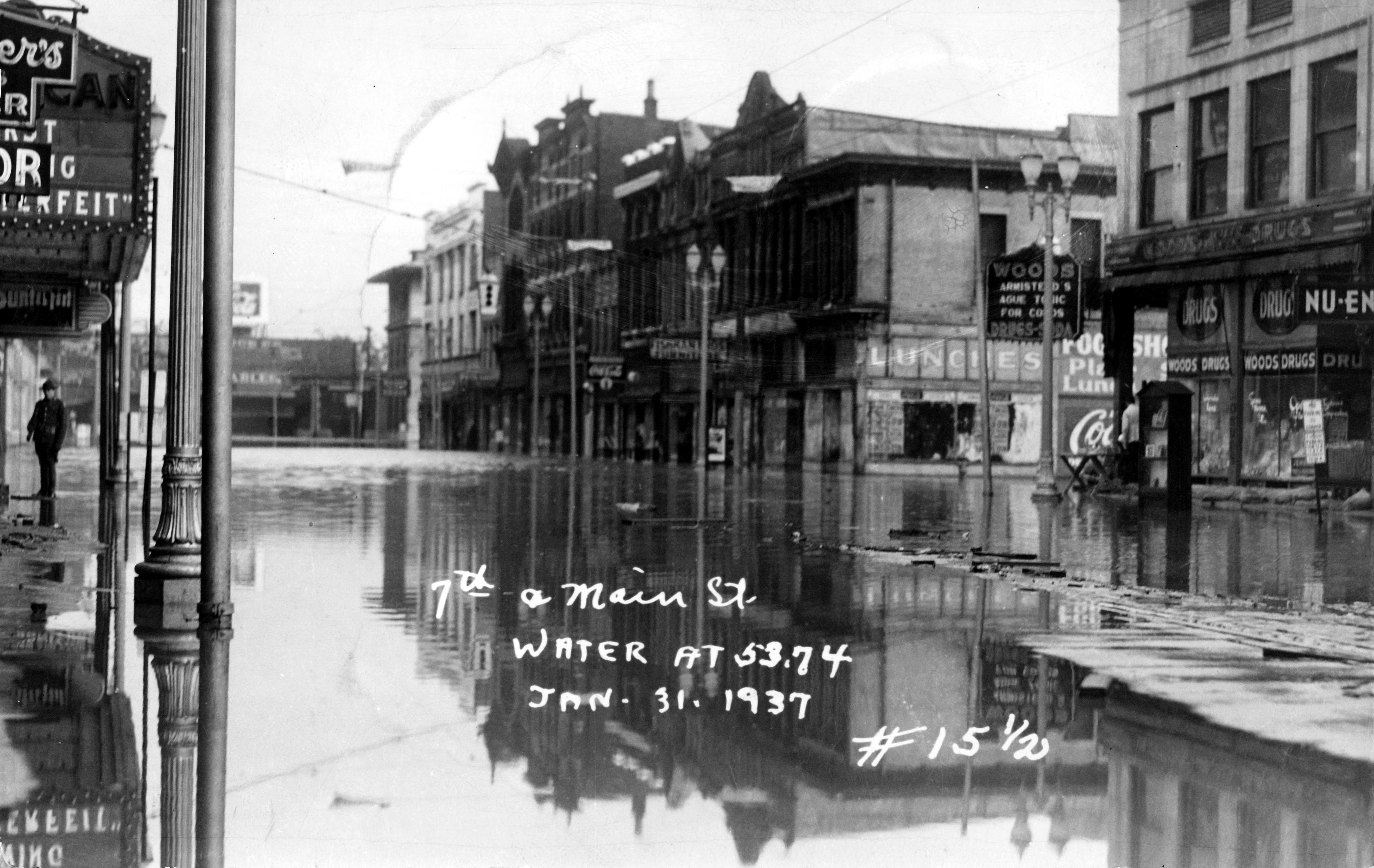 600 block of Main St. near corner with SE 7th St. H.A. Woods Drug Co. at 629-31 Main St. on right, unable to identify restaurant across 7th, but beyond that is Fishman Bros. furniture at 705 Main St. On the left, the marquee just visible is for the American Theatre at 626-28 Main St. Photograph is marked as January 31, 1937, and notes that the flood crest that day (although NOT at this location) was 53.74 ft.
