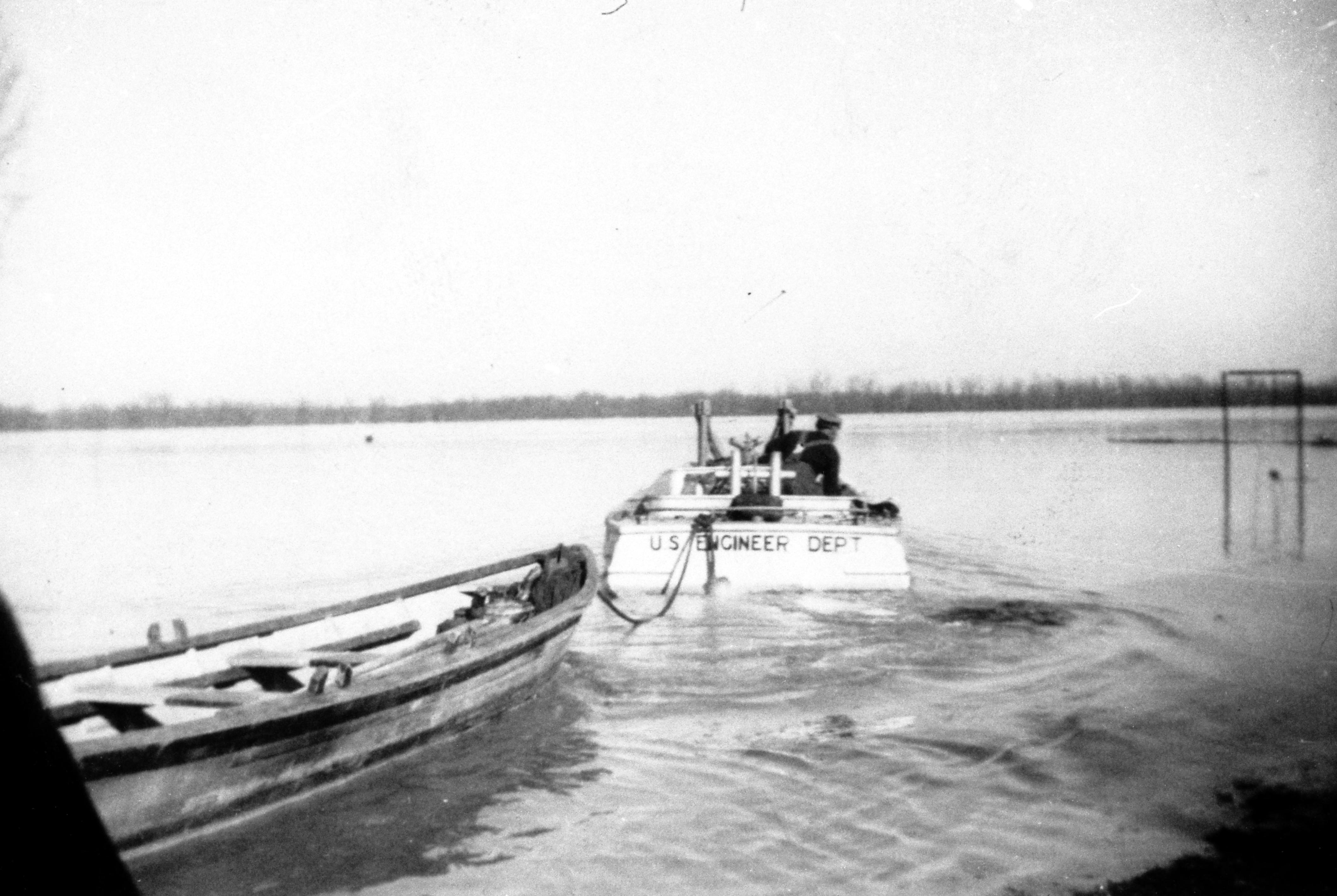 Man driving a U.S. Engineer Dept. boat, towing a rowboat, near Dam 49 in Uniontown, KY