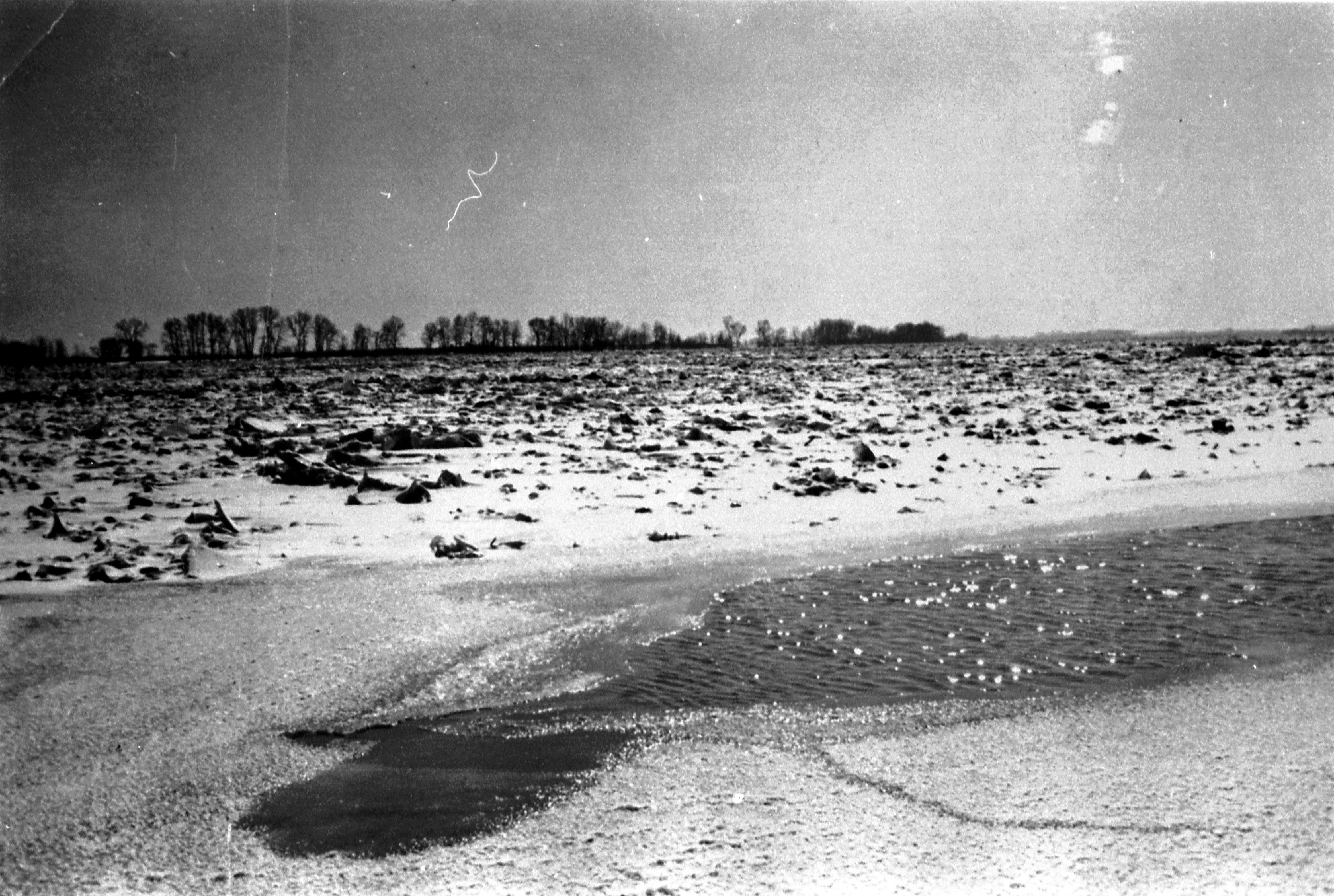 Flood waters--flowing water in foreground surrounded by snow and ice
