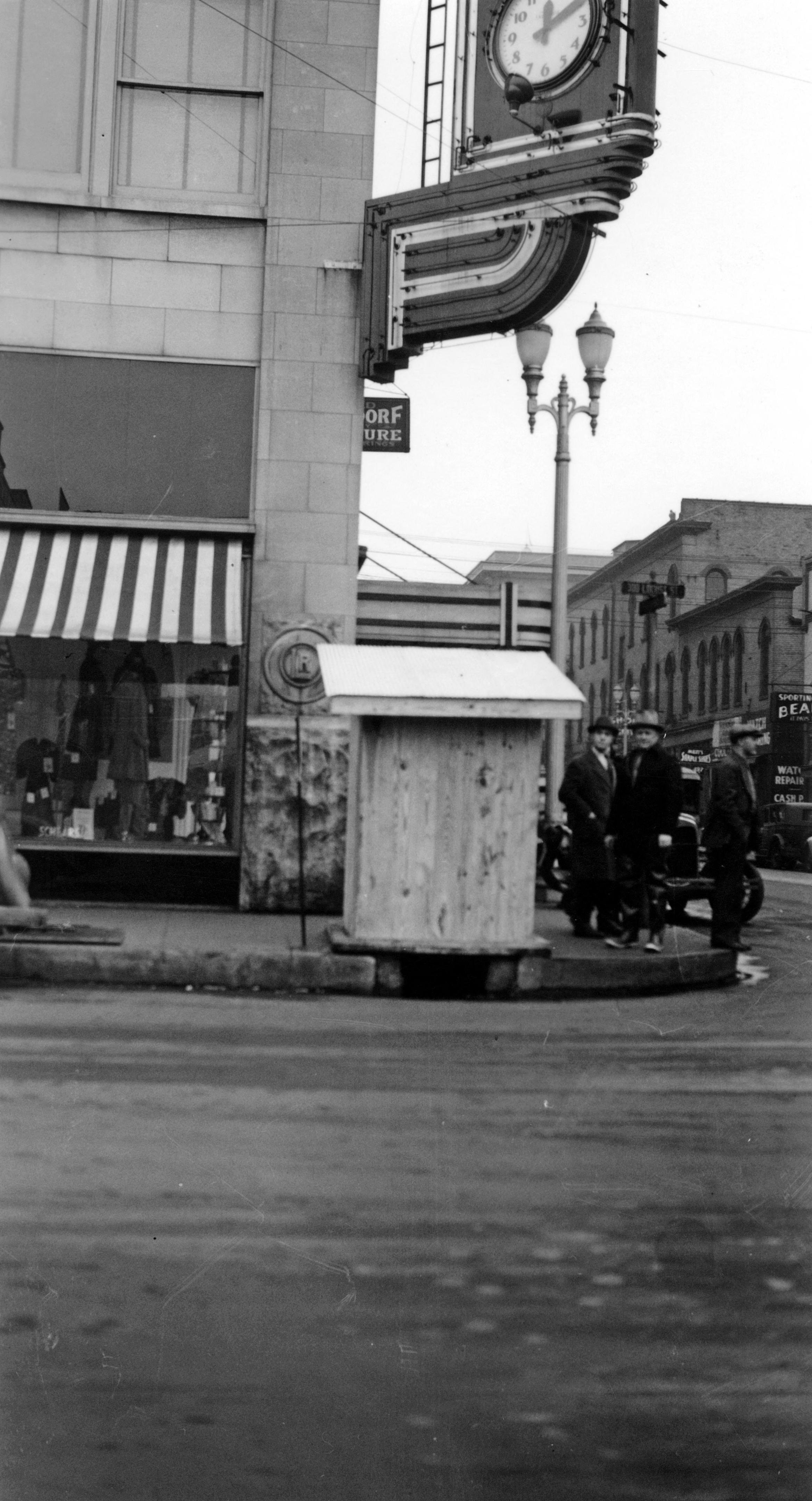 Outhouse on Locust St. at corner with SE 4th St. Behind this is the Arnold Elmendorf Co. furniture at 19 SE 4th St., and the display windows are for Schear's New York Store at 21-22 SE 4th St. Barely visible across 4th St. is G. A. Beard & Son sporting goods at 14-16 SE 4th St. Below the Beard sign is one for watch repair, probably Simon the Jeweler at 12 1/2 SE 4th St., and the shoe sign just beyond that probably belonged to Mrs. Lola M. Phelps' shoe repairs. Three men stand on corner next to outhouse. No visible flooding.