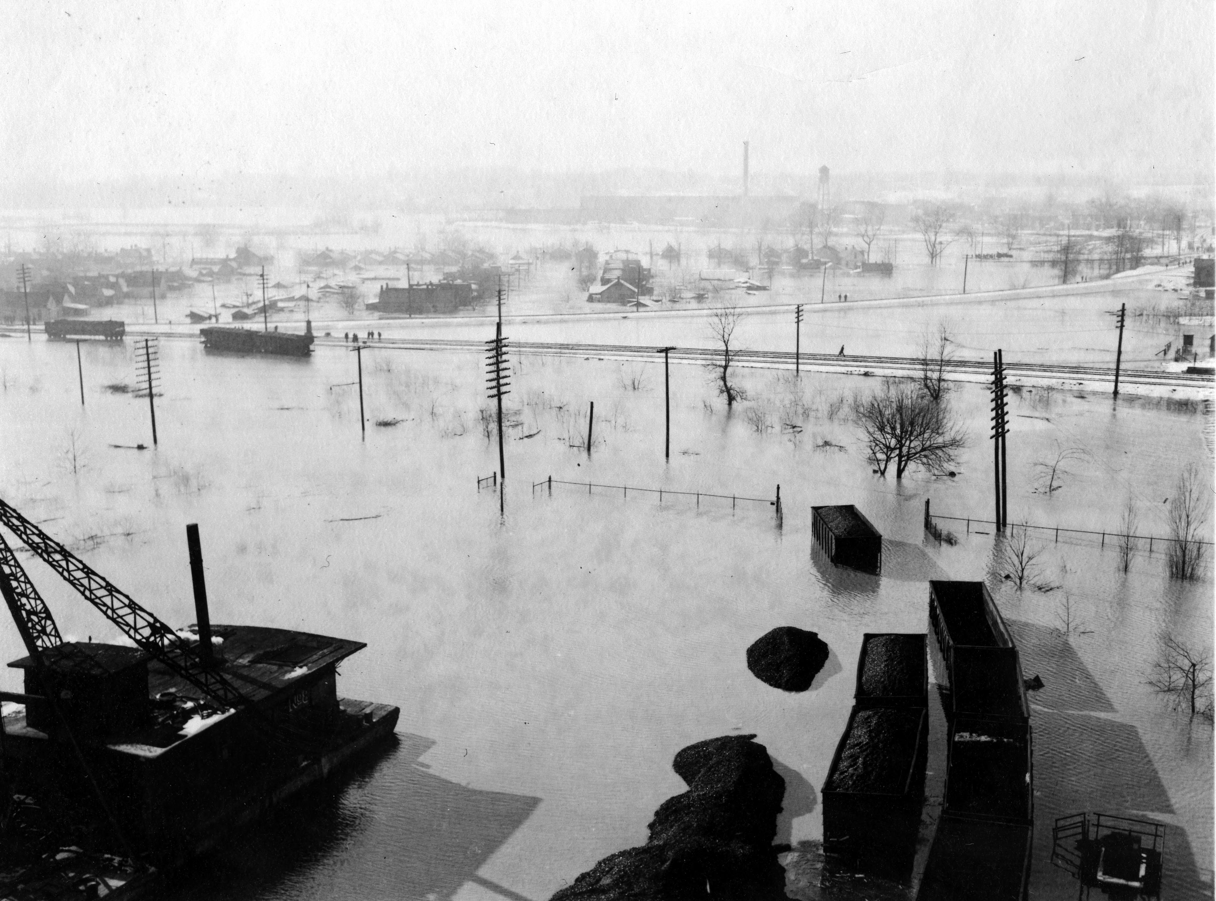 Howell area , taken from top of Southern Indiana Gas & Electric Co. power house at 15 E. Indiana, showing flooded houses and rail cars
