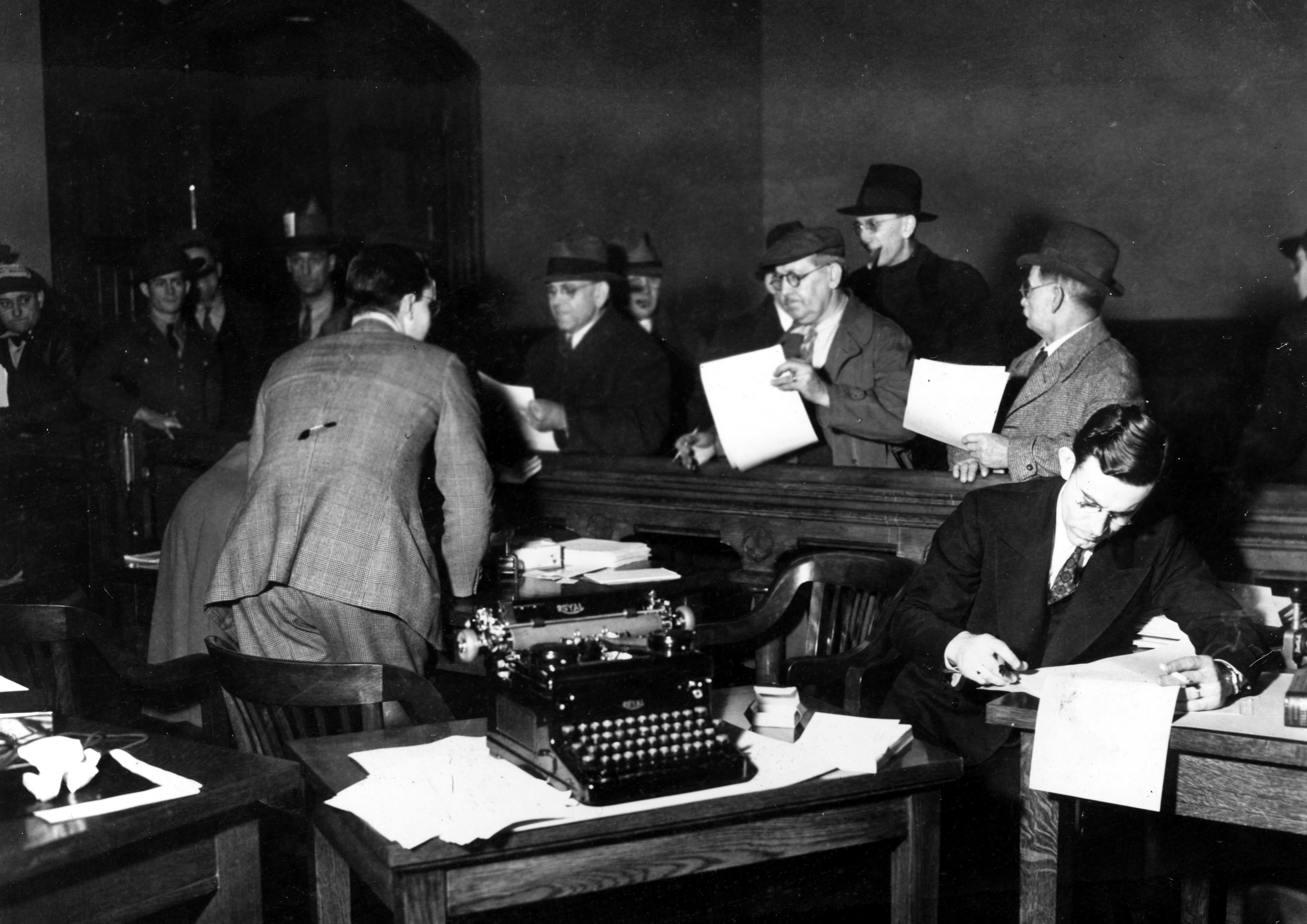 Men holding sheaves of paper in a line behind a barrier of some sort, applying to reopen businesses. Man in right foreground appears to be getting ready to sign a document. Two people in middle ground leaning over to talk to people behind barrier.