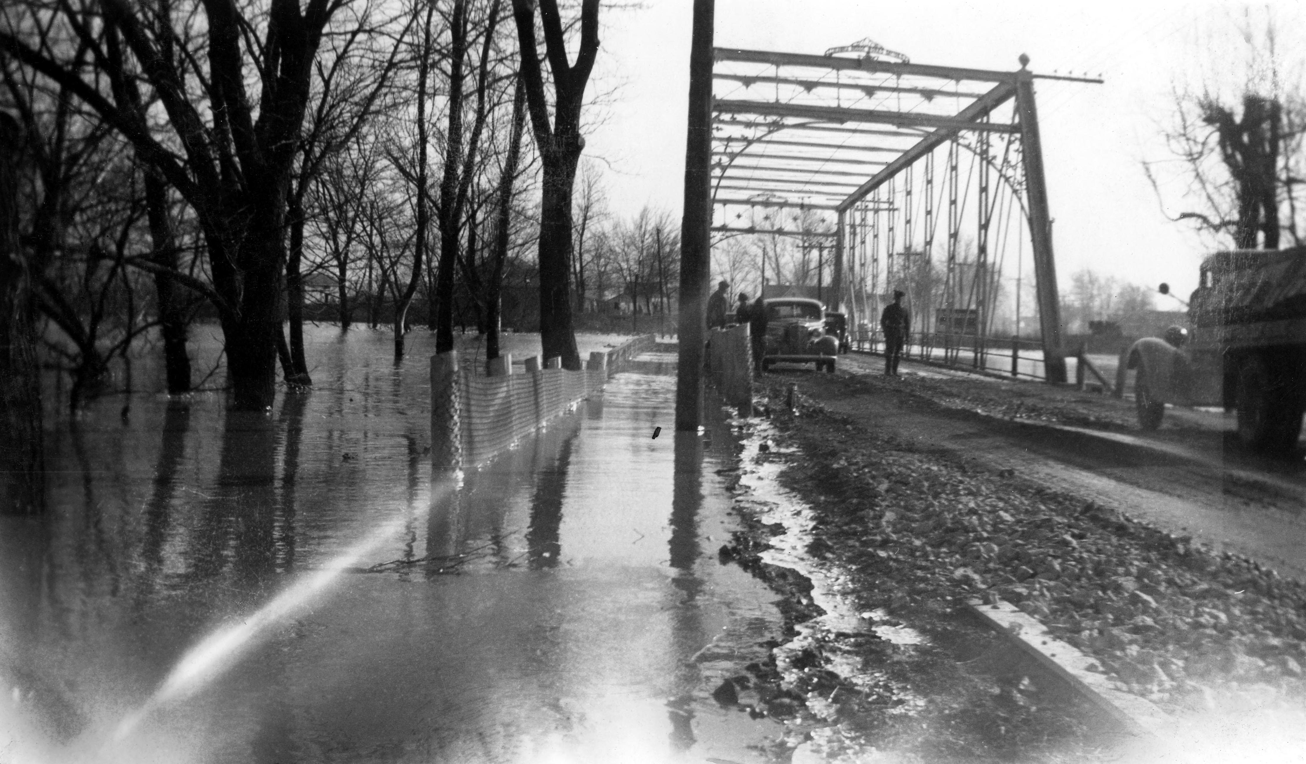 Close-up of Stringtown Rd. bridge over Pigeon Creek, with car and truck crossing amid flooding, but bridge above water. Several people stand on bridge.