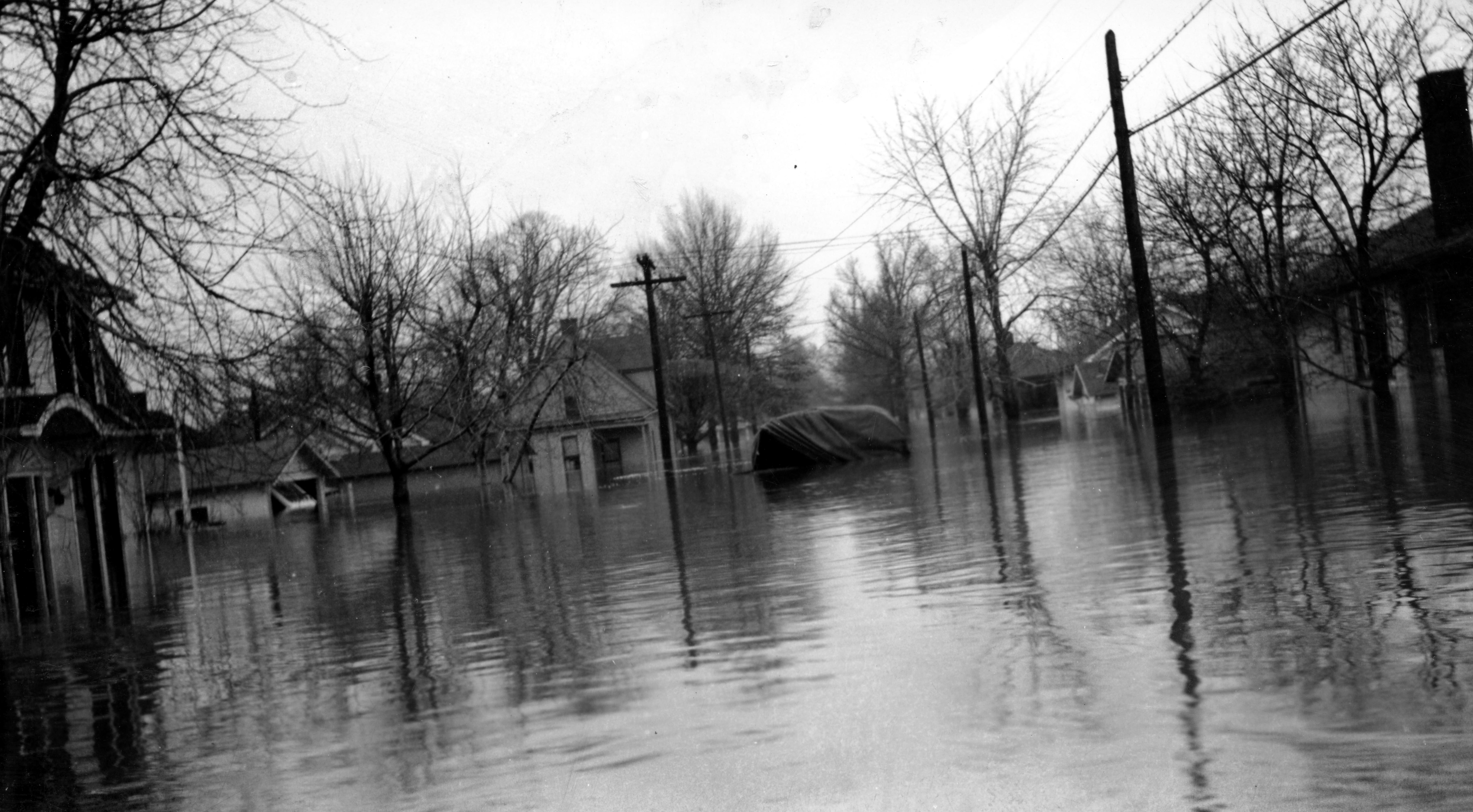 Residential neighborhood of S. Evans Ave. and Ravenswood Dr. Large partially covered object (truck?) in middle ground. Houses appear to be approximately halfway flooded.