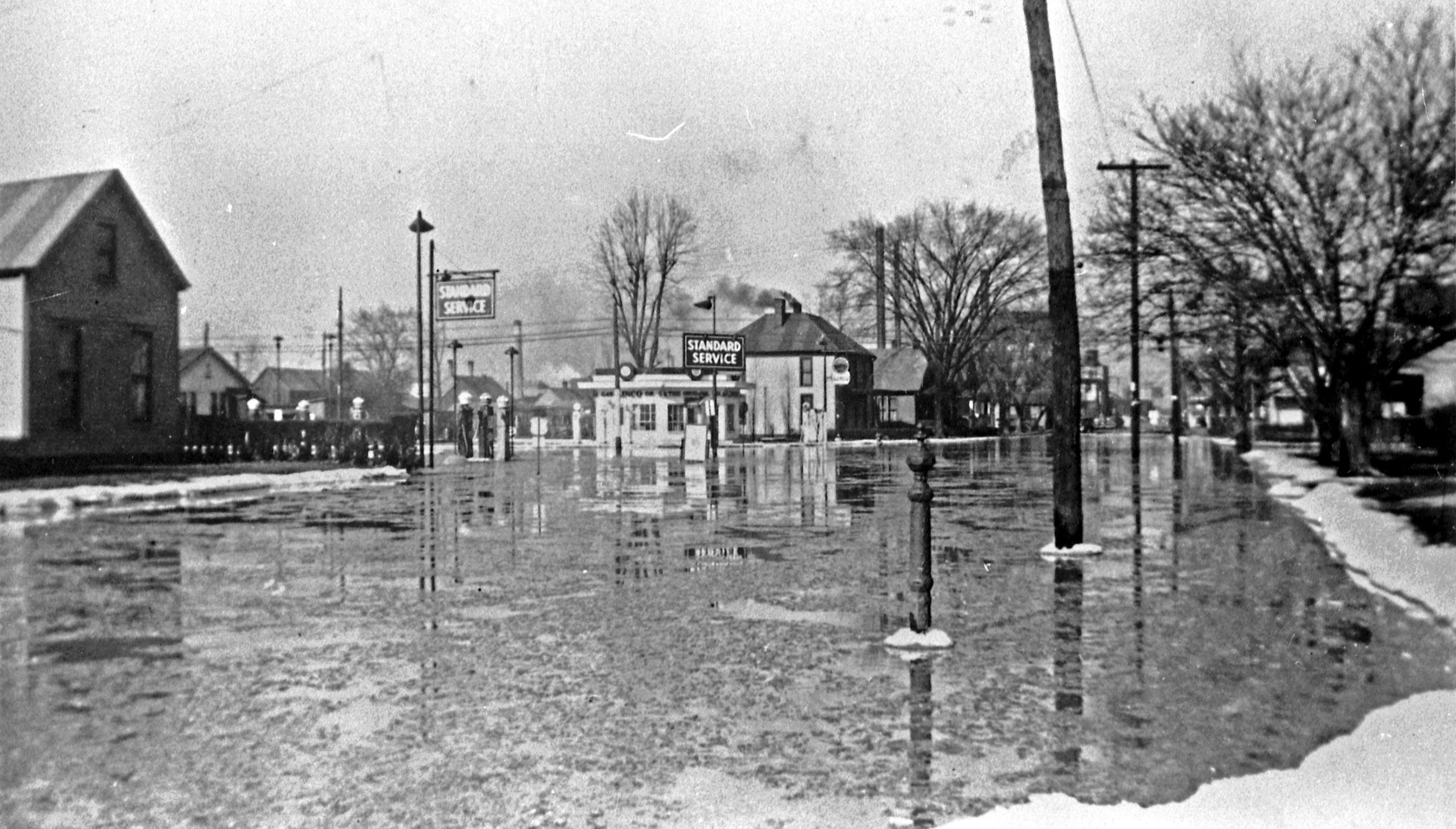 S. Kentucky Ave. and E. Riverside Dr. Street covered with ice and water, but appears to be below curb level. Standard Service filling station at 1650 S. Kentucky Ave. in middle ground.