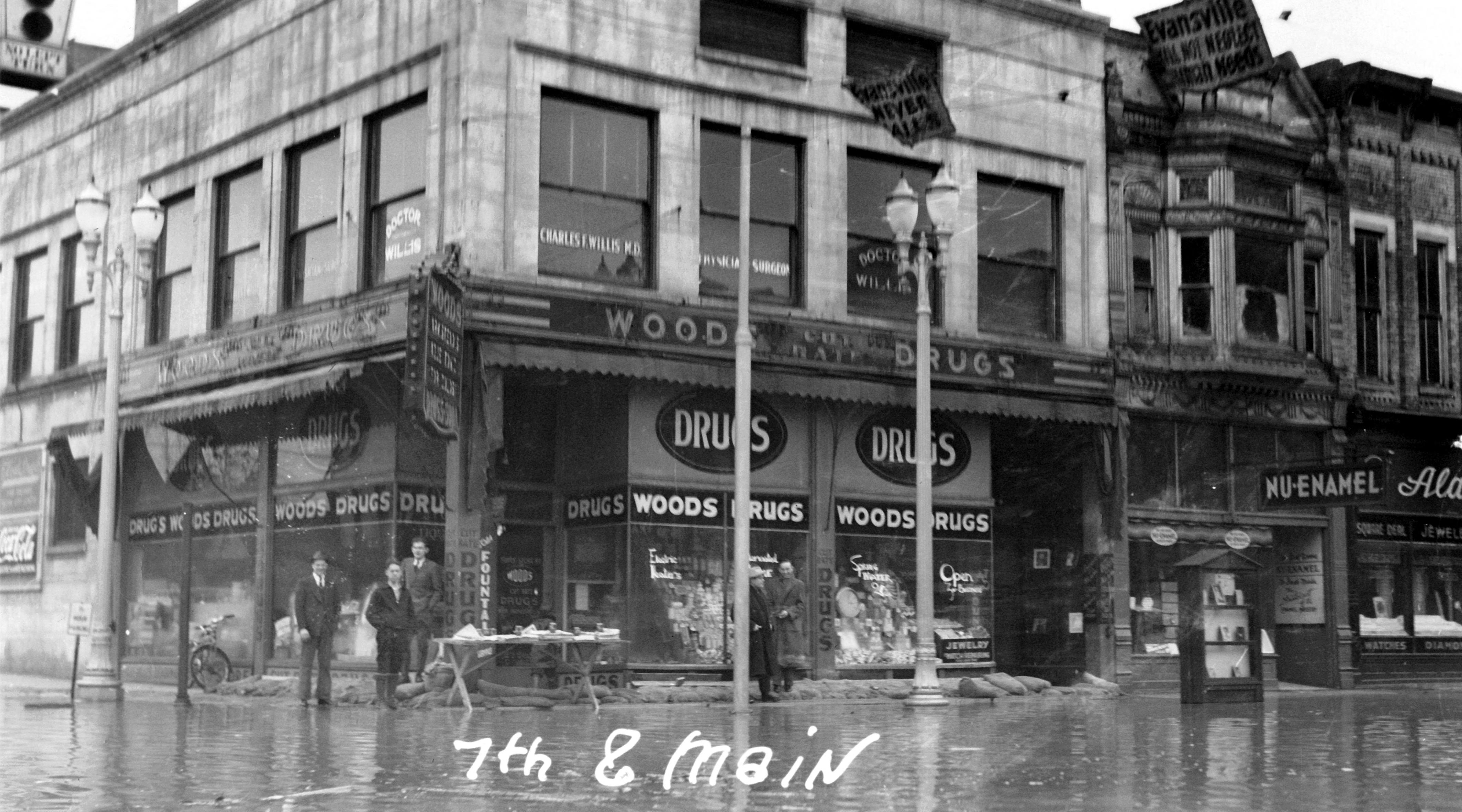 H.A. Woods Drug Co. at 629-31 Main St. , at corner with SE 7th St. Five men stand on sidewalk by sandbags. Above the drugstore are the offices of Willis & Willis, physicians, at 629 1/2 Main St. Going up Main St., the next business is Nu-Enamel Evansville Co. (paints) at 627 Main St. and then Alan's Square Deal Jewelers at 625 Main St.