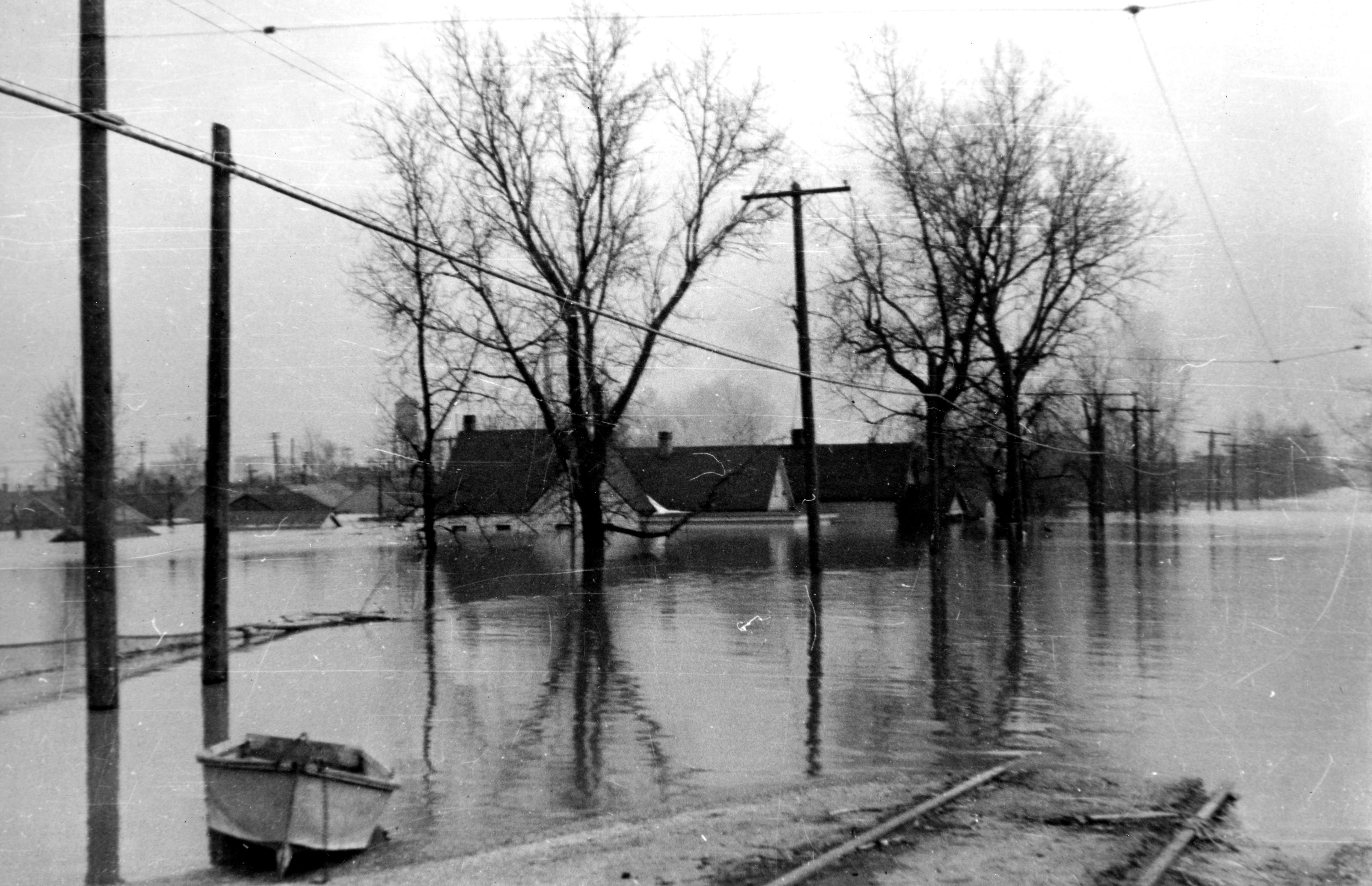 Houses with water up to eaves or over. Streetcar tracks in the foreground disappear into water. Boat (tied up?) near tracks.