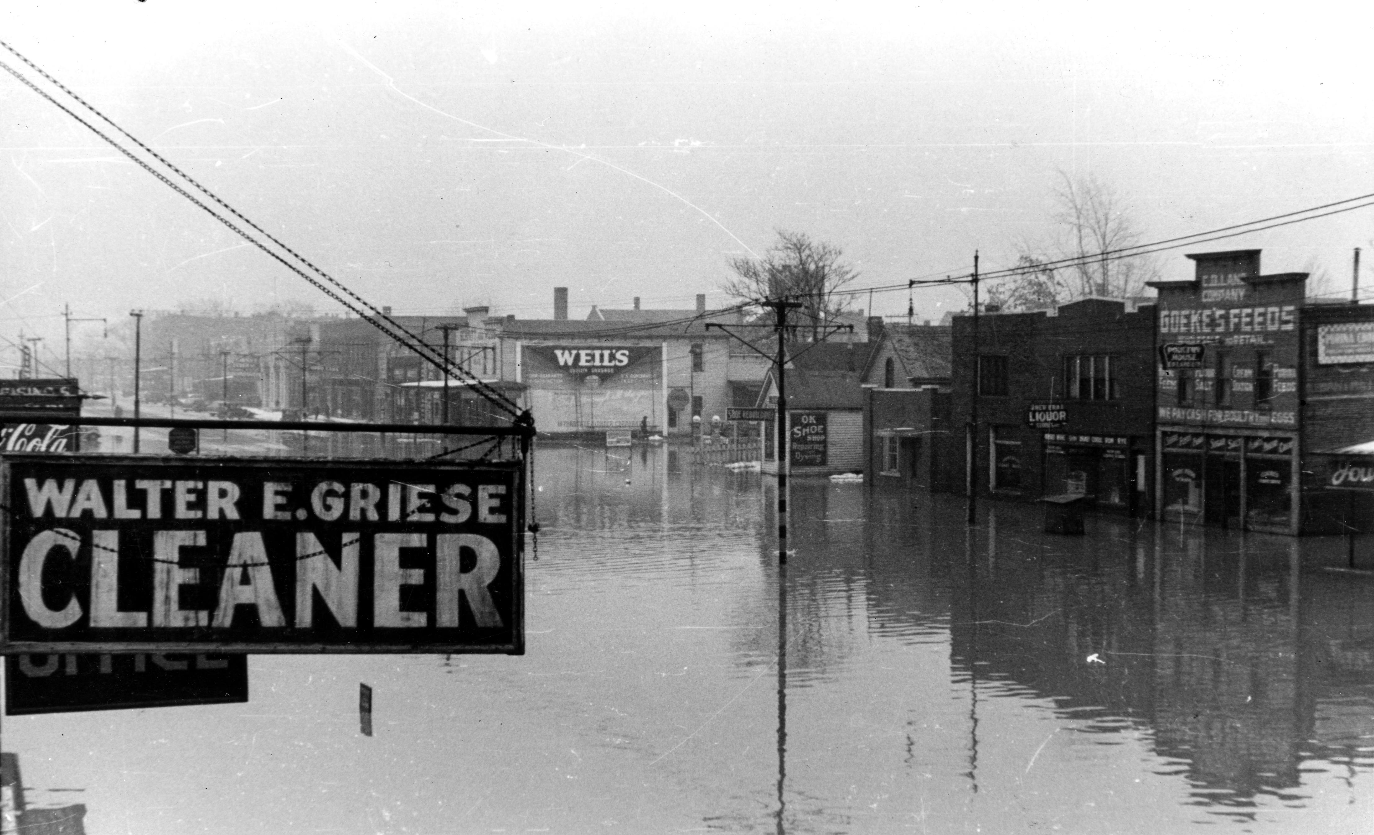 2300 block of W. Franklin St. Identifiable businesses on left are Walter E. Griese Cleaner at 2337 W. Franklin St.; on right are C.O. Land & Co. feed and poultry store at 2318 W. Franklin St. (building that says Goeke's Feeds), New Era Liquor Store at 2316 W. Franklin St., OK Shoe Shop (none by this name identified, but could be one owned by Elmer Kasbahm) at 2308 W. Franklin St., Schmitt & Rode Grocers (building with advertisement for Weil's on side) at 2232 W. Franklin St. Filling station just visible between grocery and shoe shop is on the corner with 12th Ave.--Val & Ed Shell Service at 2300-04 W. Franklin St.