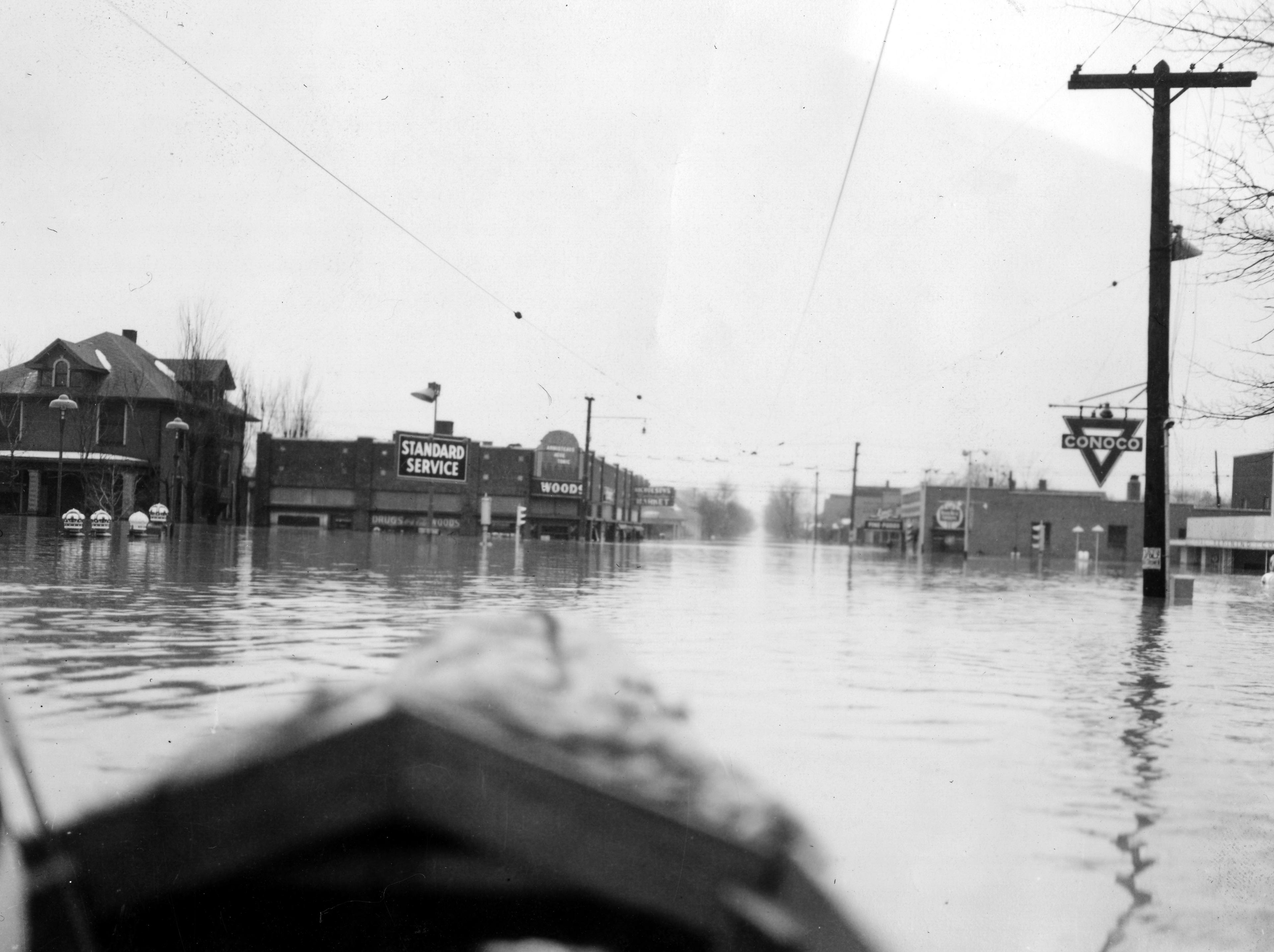 Flooded intersection of S. Kentucky Ave. and Washington Ave. On left: Standard Service Station at 968 S. Kentucky Ave., Woods Drug Store at 1001 Washington Ave., Nicholson Brothers Market at 1010 S. Kentucky Ave. On right: filling station owned by Charles L. Sargent at 971 Washington Ave. Gas tanks on left almost submerged. Bow of boat in immediate foreground.