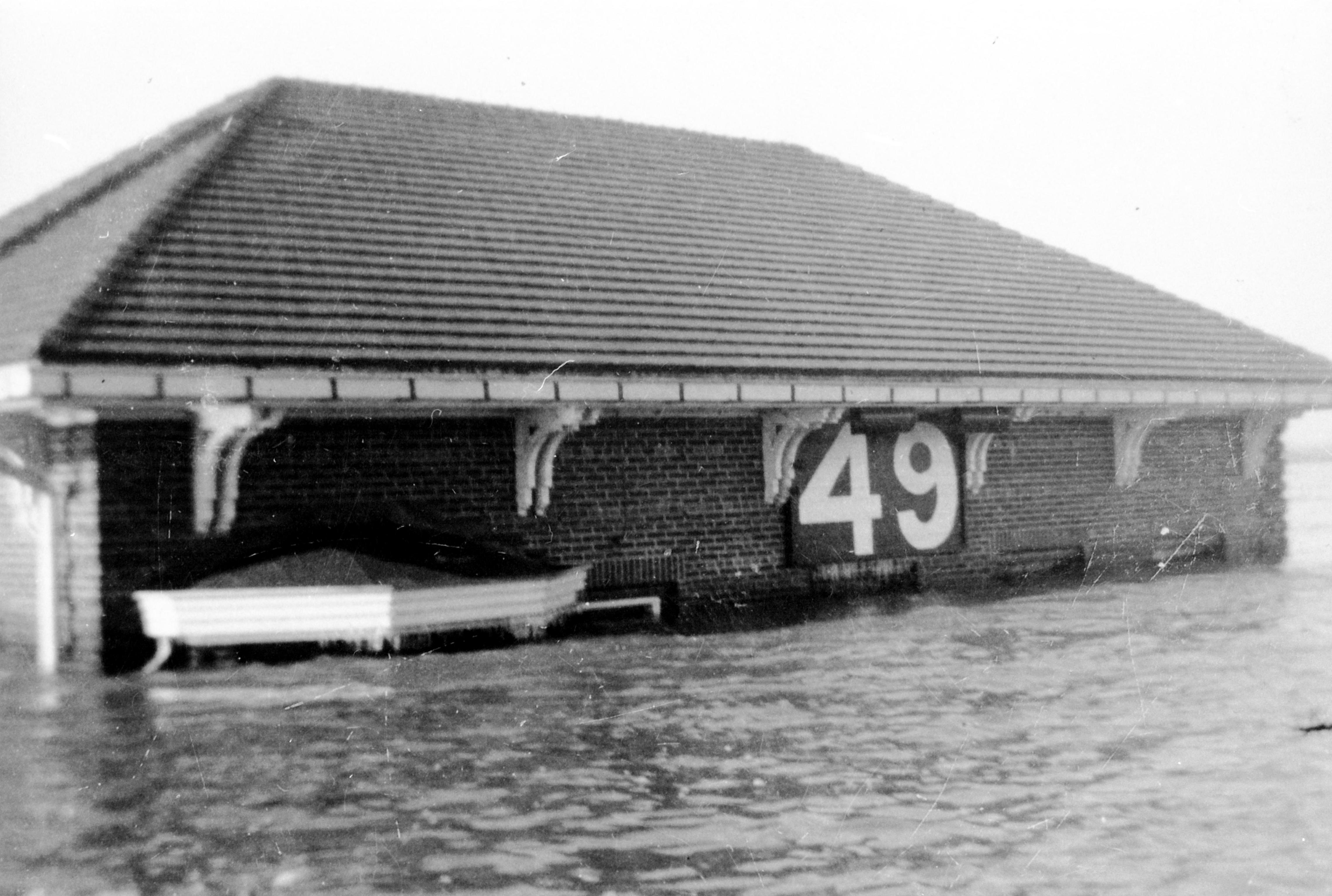 Brick powerhouse at Dam 49 in Uniontown, KY, completely surrounded by water. This view shows the number painted on building, right under the eaves--the water is almost up to this point.
