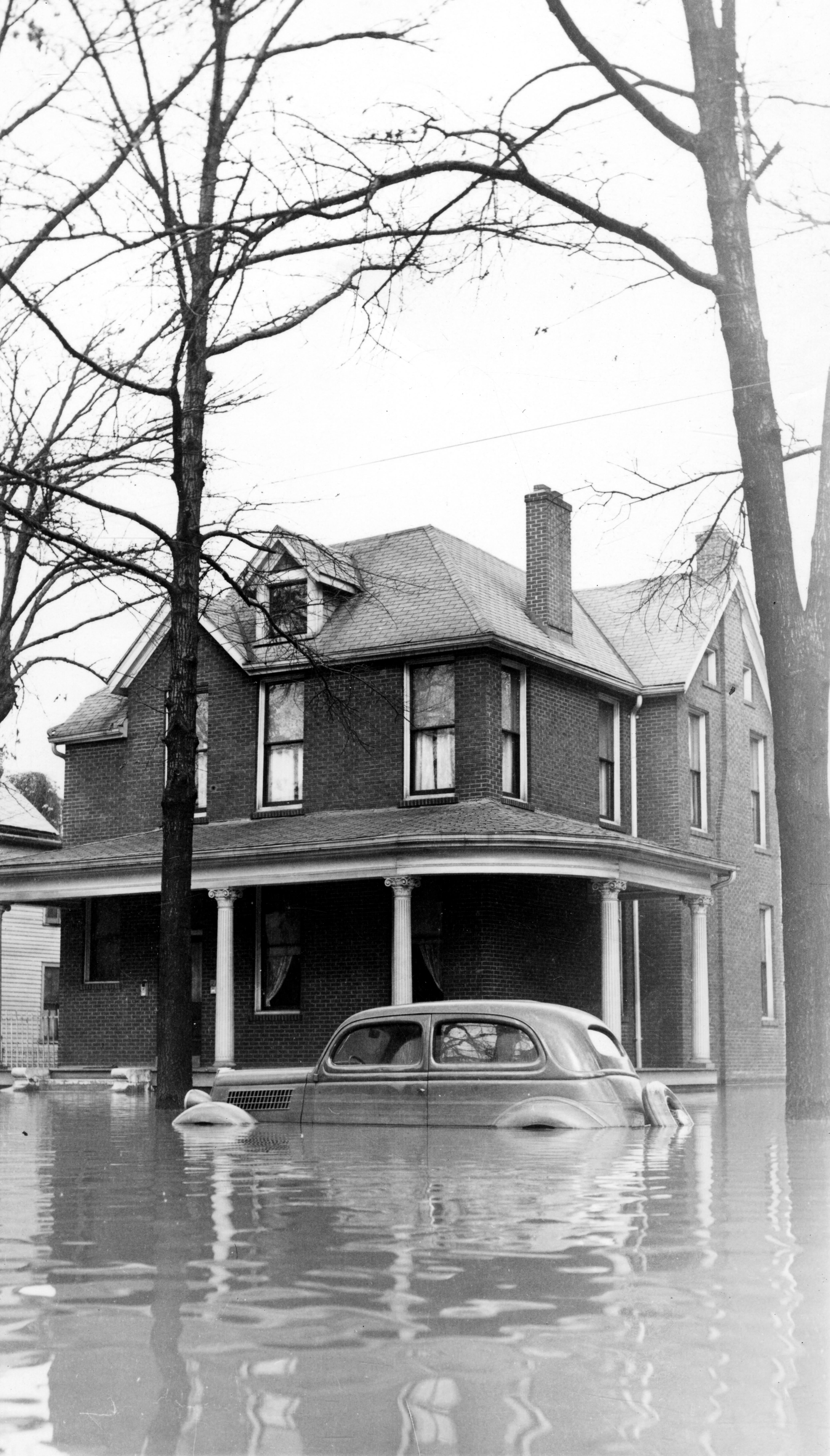 Car with water over its tires in front of large brick residence with water up to porch. Probably Washington Ave. (same house as 0453)