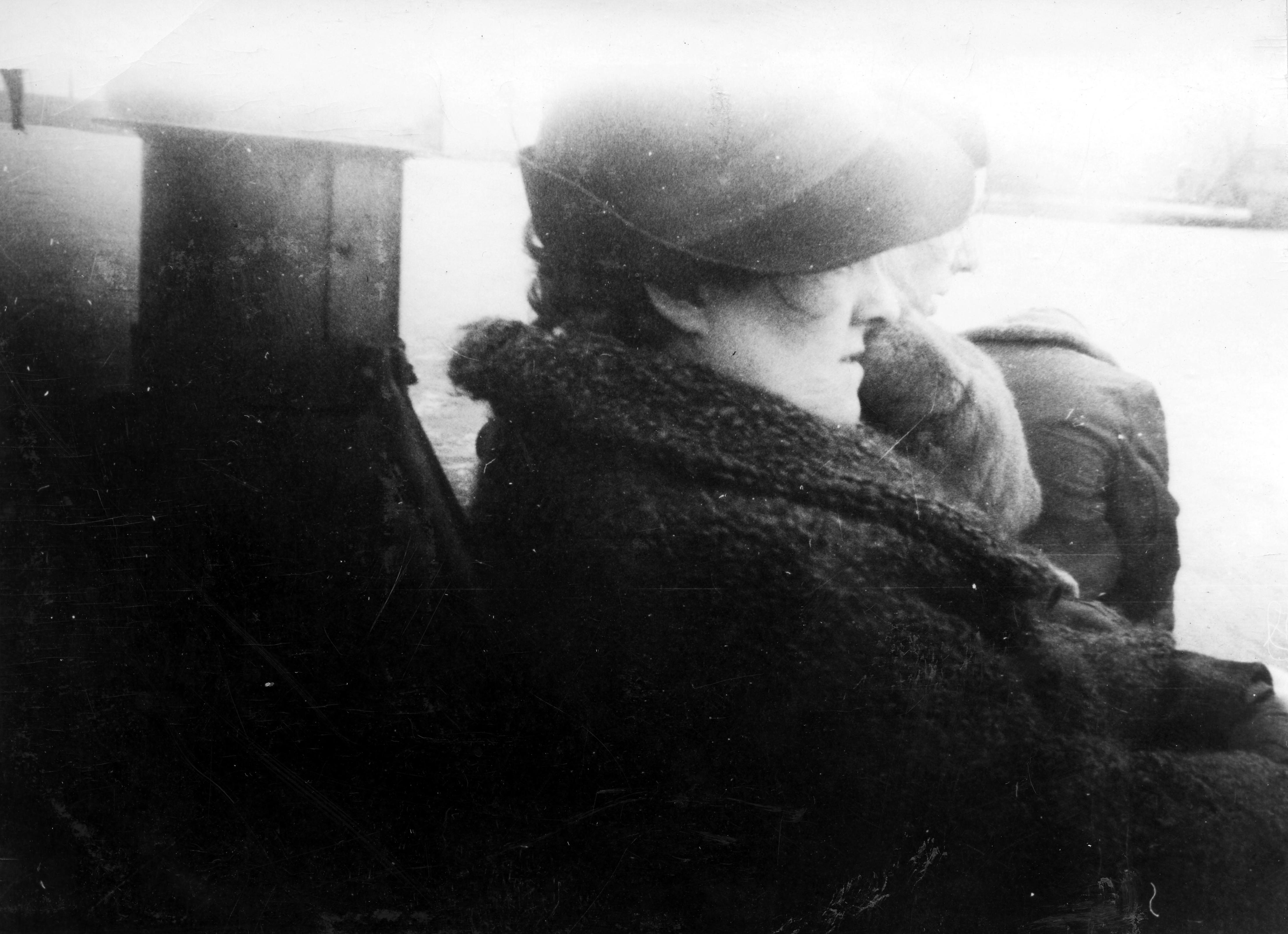 Close-up of two women identified as Mrs. Beverly and Mrs. Emanual on boat, with third person sitting with back to camera, on American Red Cross damage assessment tour, January 30, 1937