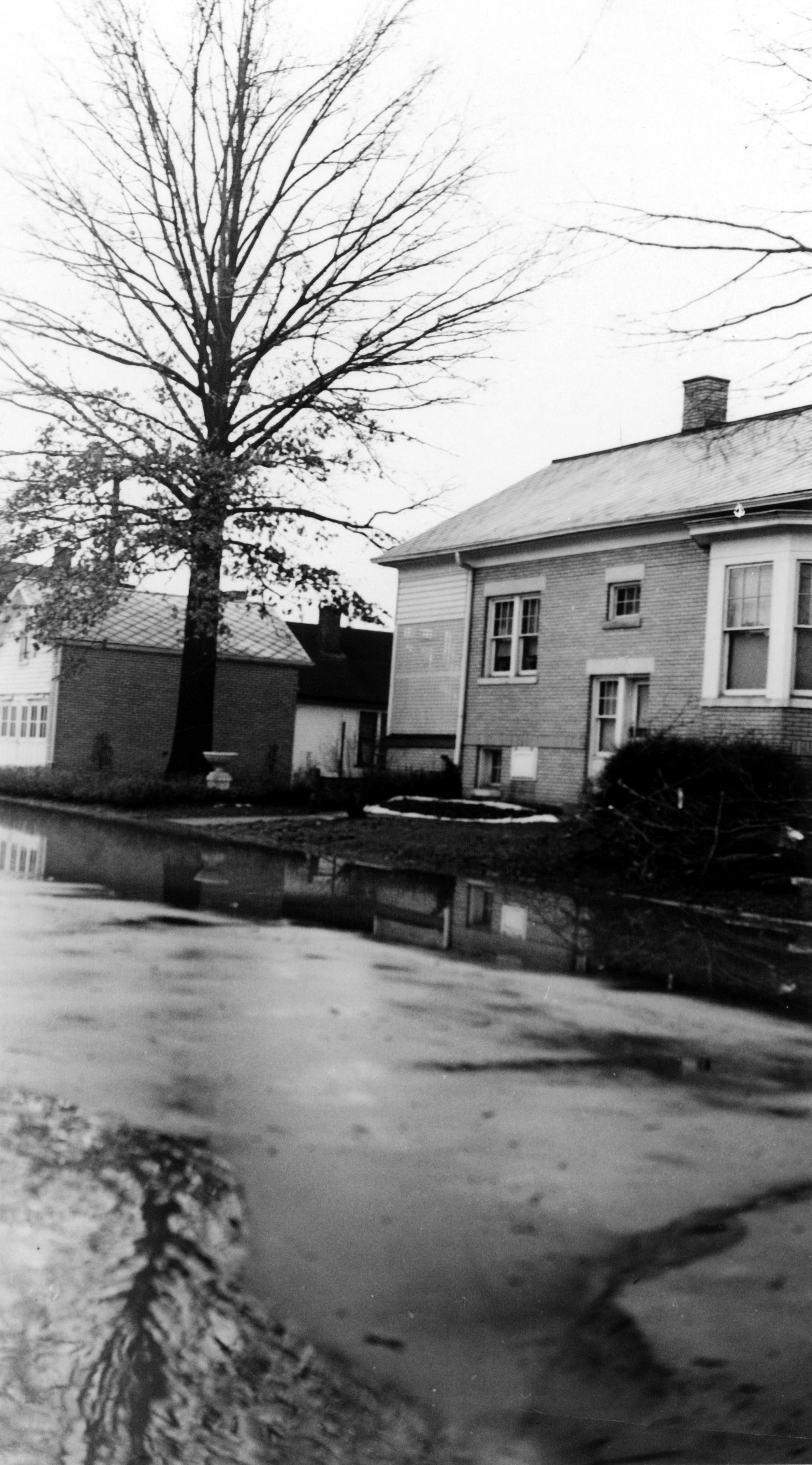 Unidentified brick house with some residual snow on yard and water at curb level