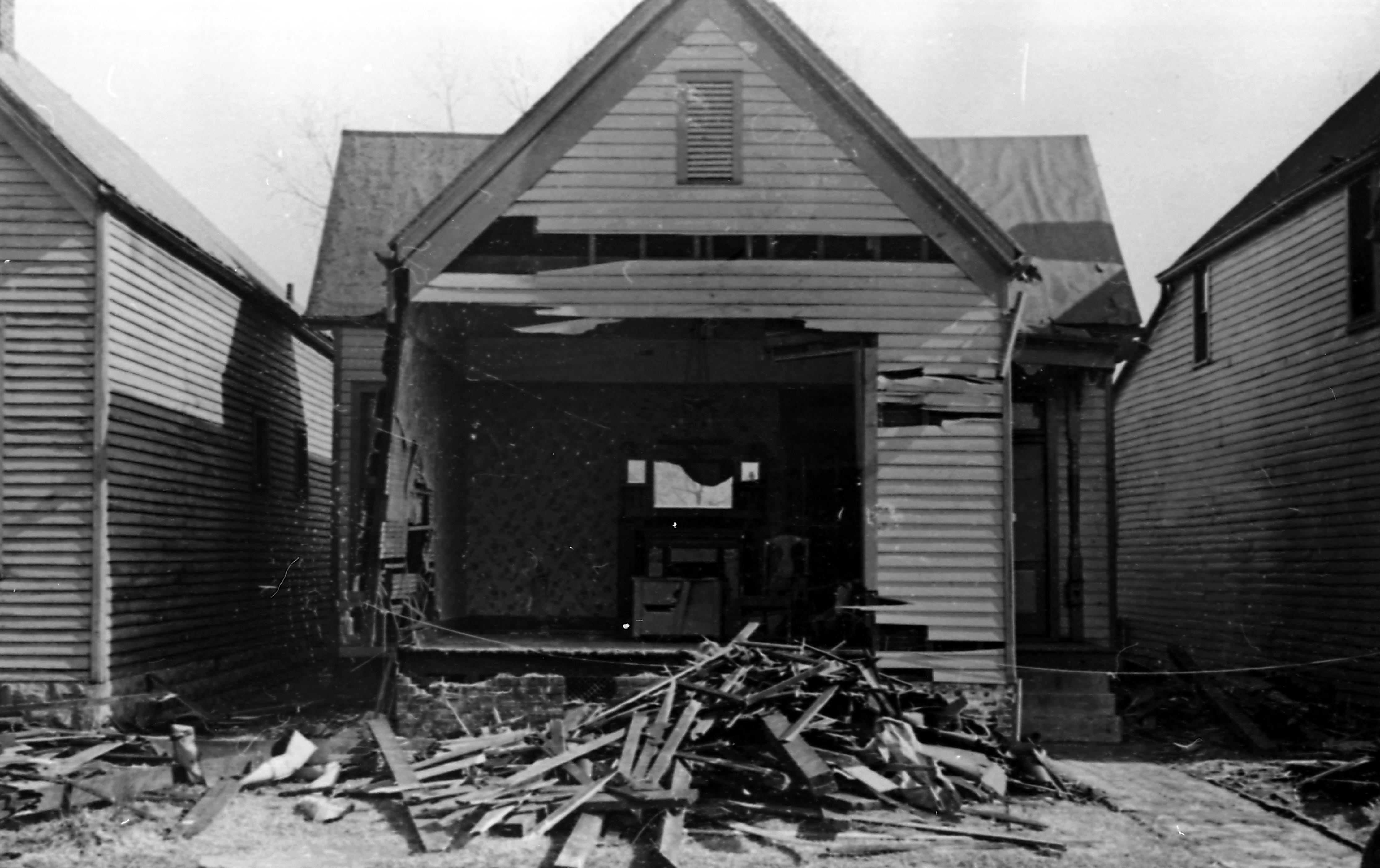 Arthur Krueger home at 905 N. Elliott St., near intersection with E. Maryland St.. Outside wall of front room blown away.
