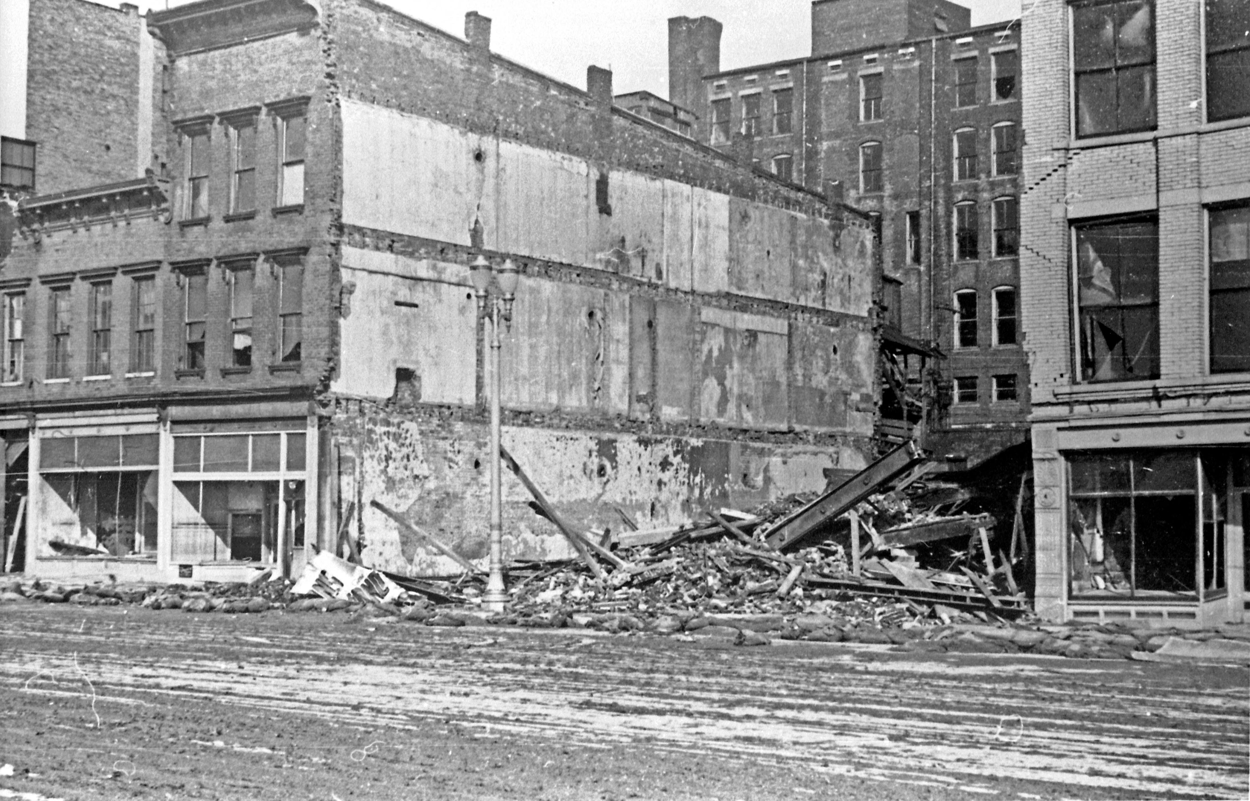 Damaged or destroyed buildings on Main St. & Riverside Dr.