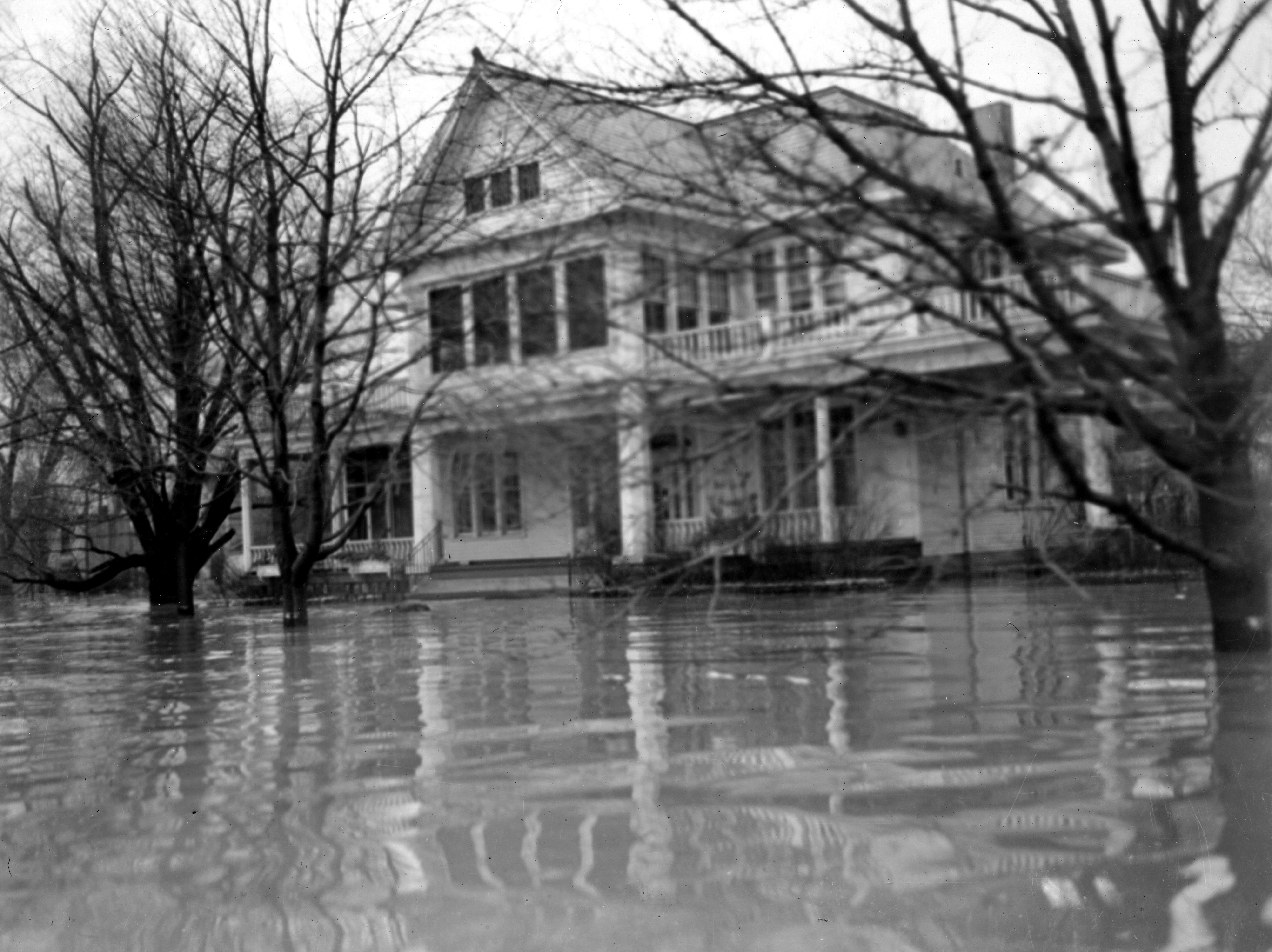 Large frame residence at the intersection of Sunset Ave. and Shawnee Dr. Water appears to be part way up the porch steps.