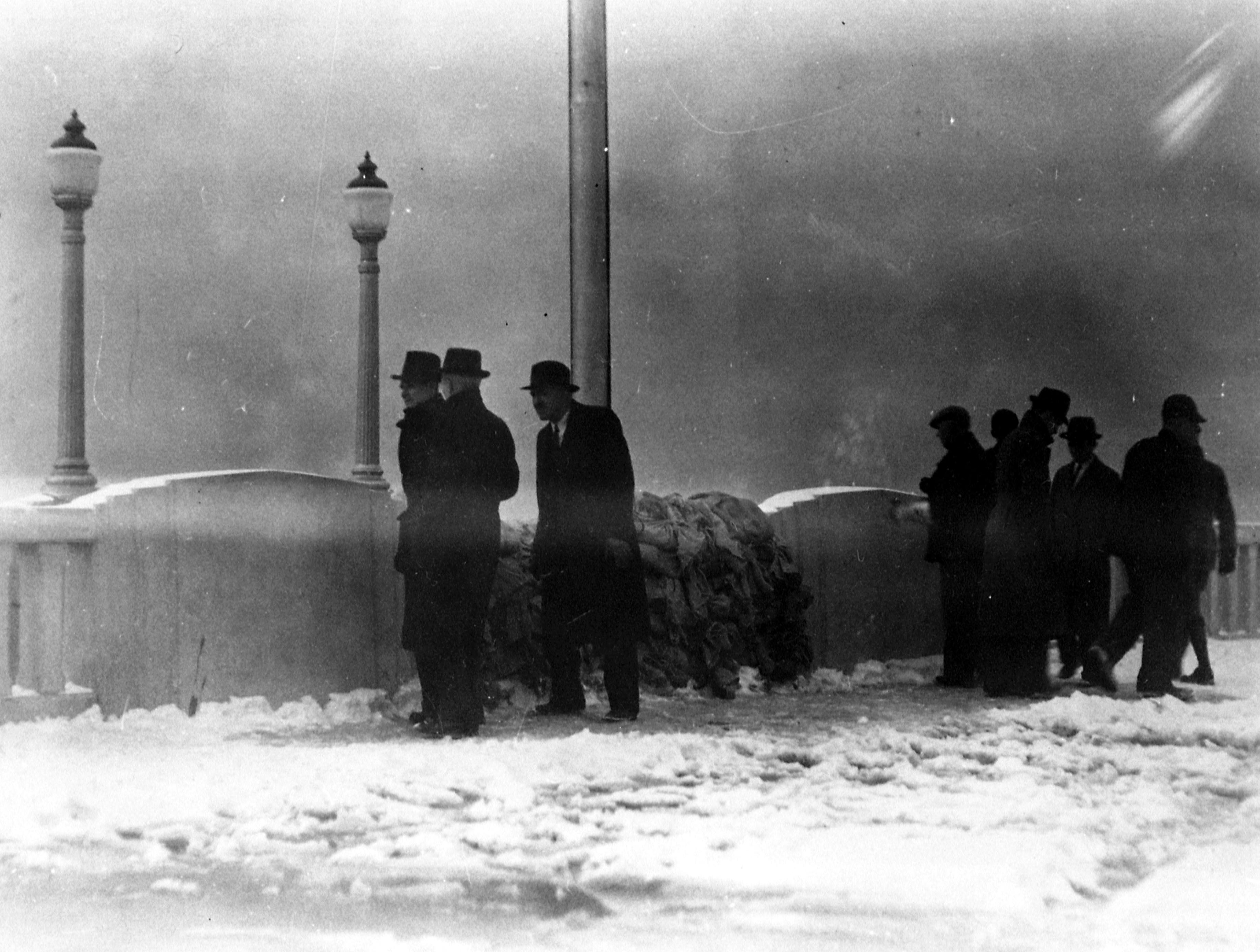Men standing on bridge overlooking Dress Plaza, snow on ground. Empty sandbags hanging on bridge.