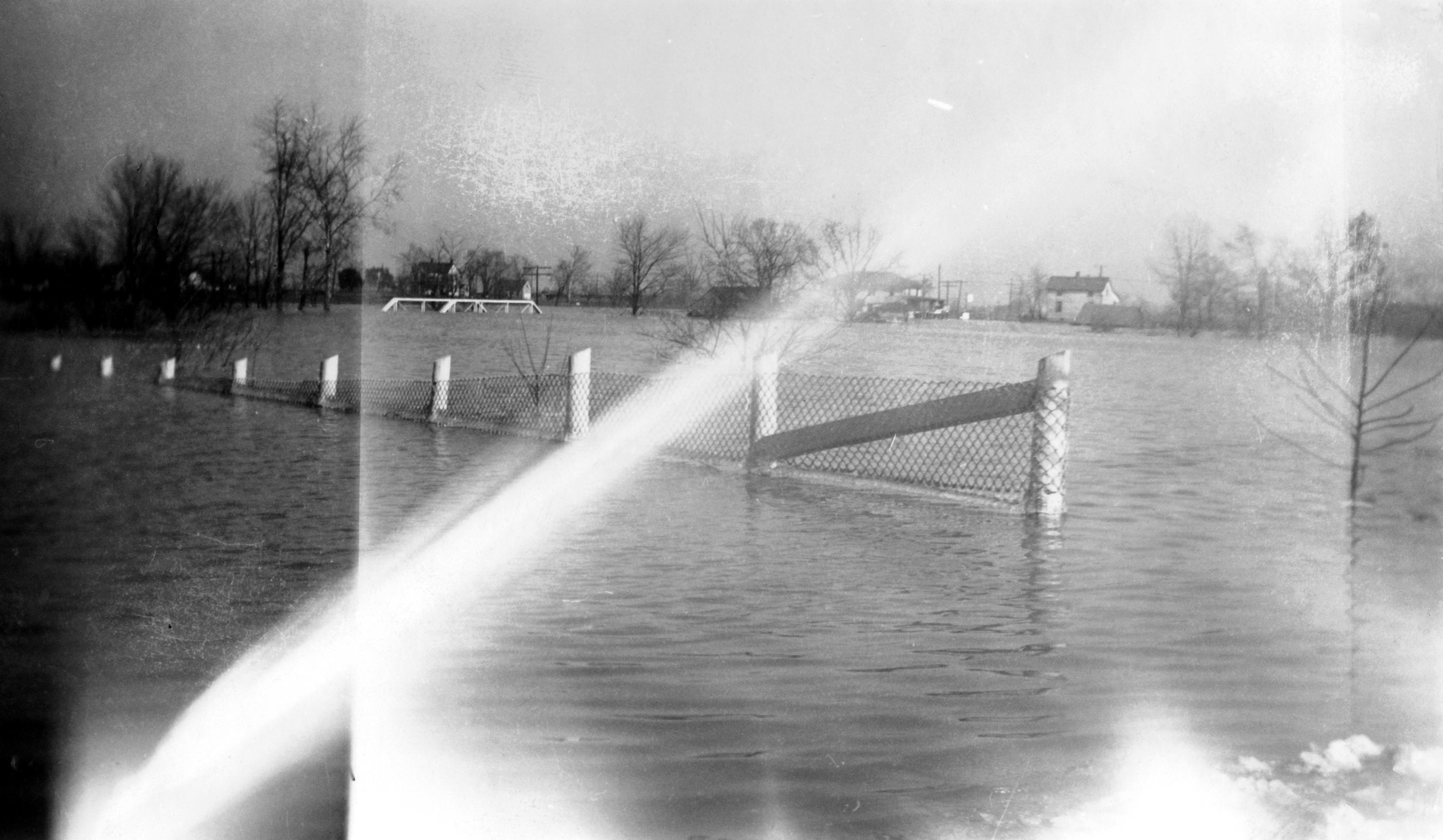 Looking across a flooded expanse, with a fence in the foreground, houses in the rear, and what appears to be a mostly flooded bridge in the center. Said to be Pfeiffer Rd. and N. Kentucky Ave., with Scorpio's Tavern in the background. The 1937 city directory contains no such tavern, nor does it list a Pfeiffer Rd., although it is possibly neither is listed because they were not within the city limits.
