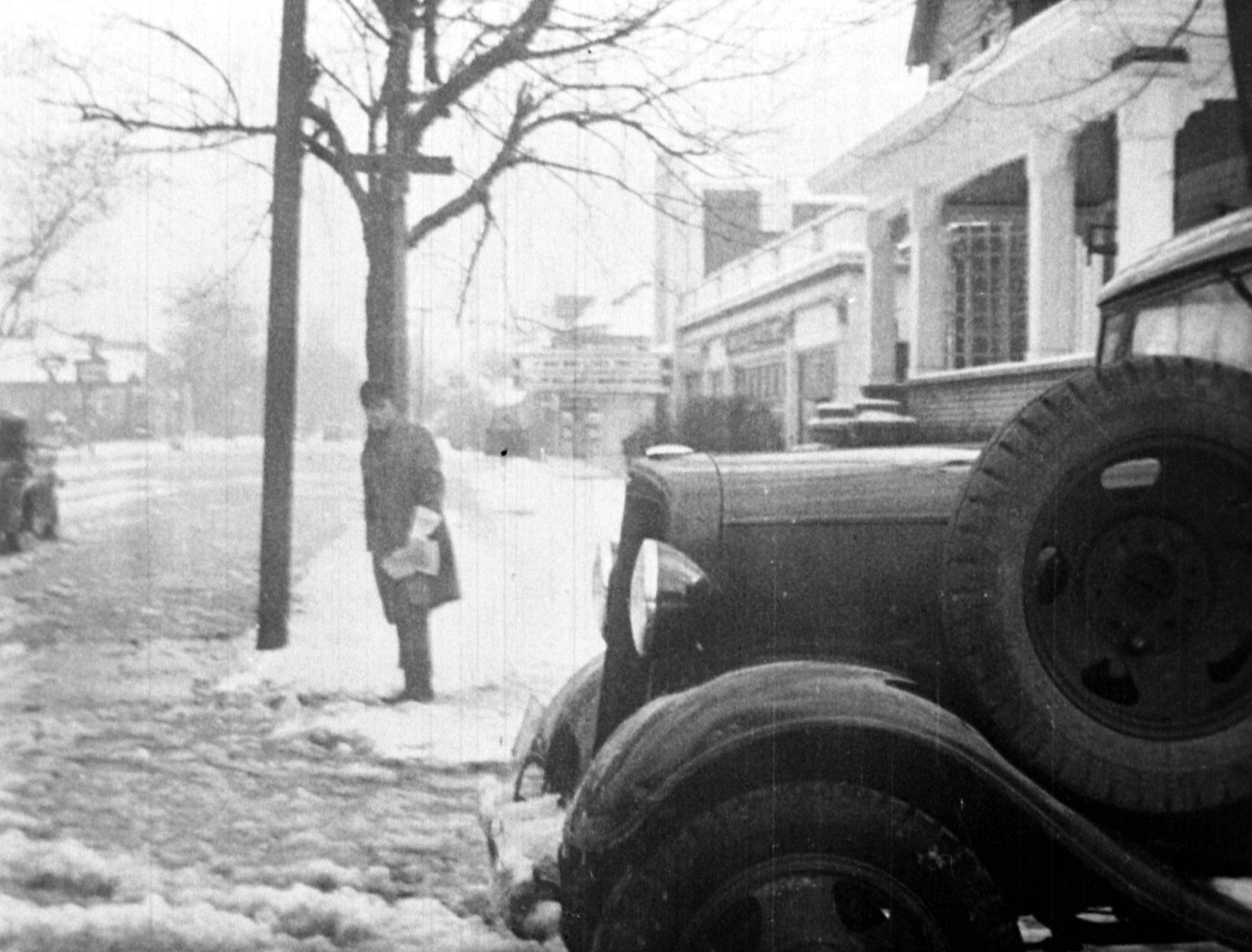 Man holding papers/package standing on corner of Washington Ave. and either S. Grand Ave. or S. Bedford Ave. in front of residences, with Washington Theatre at 969 Washington Ave. in background. Truck in foreground of cross street. Looking east on Washington Ave.