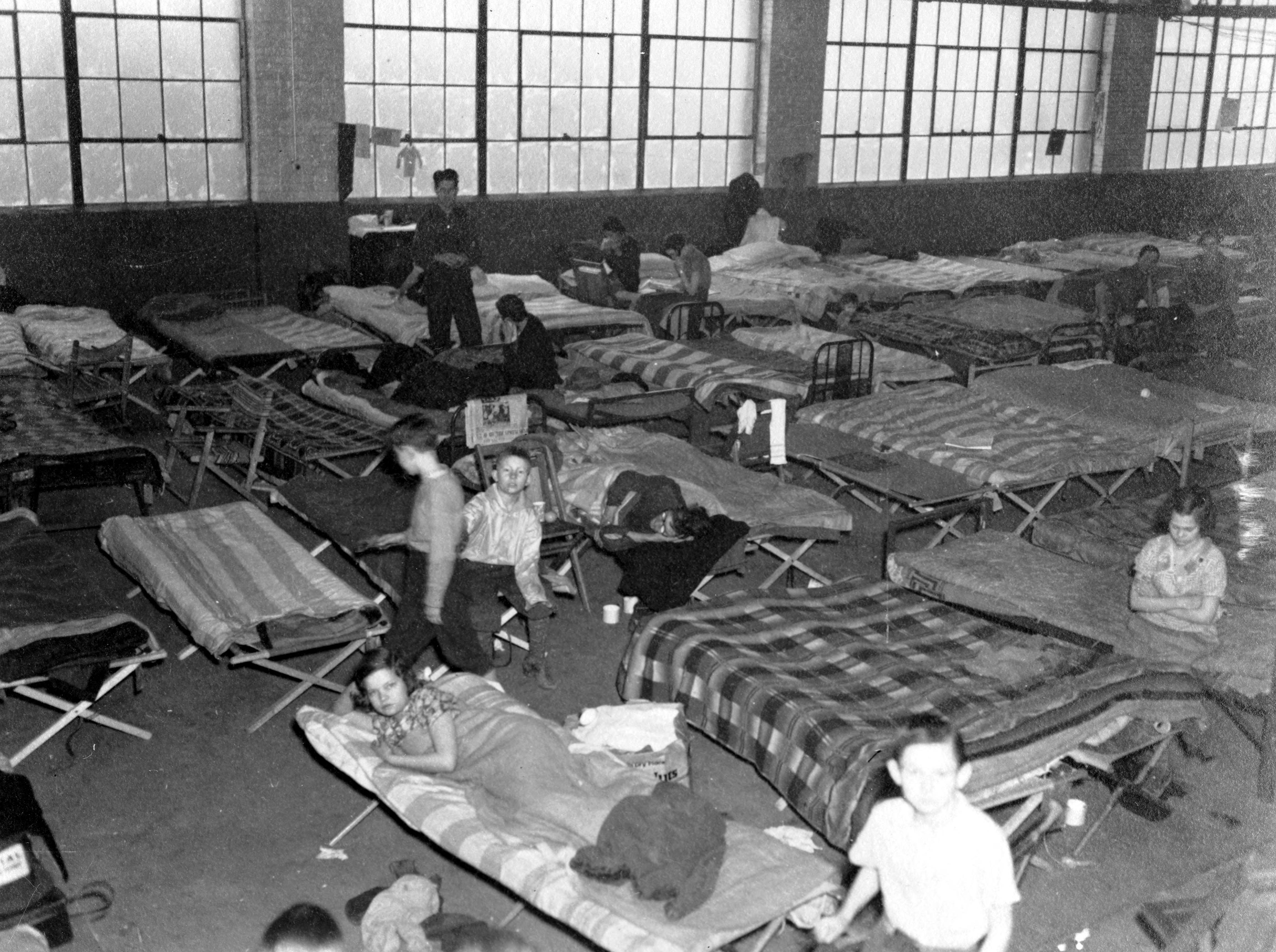 Children on cots in sleeping quarters at the American Red Cross refugee station at the Chrysler plant at 1625 N. Garvin at Stringtown Rd.