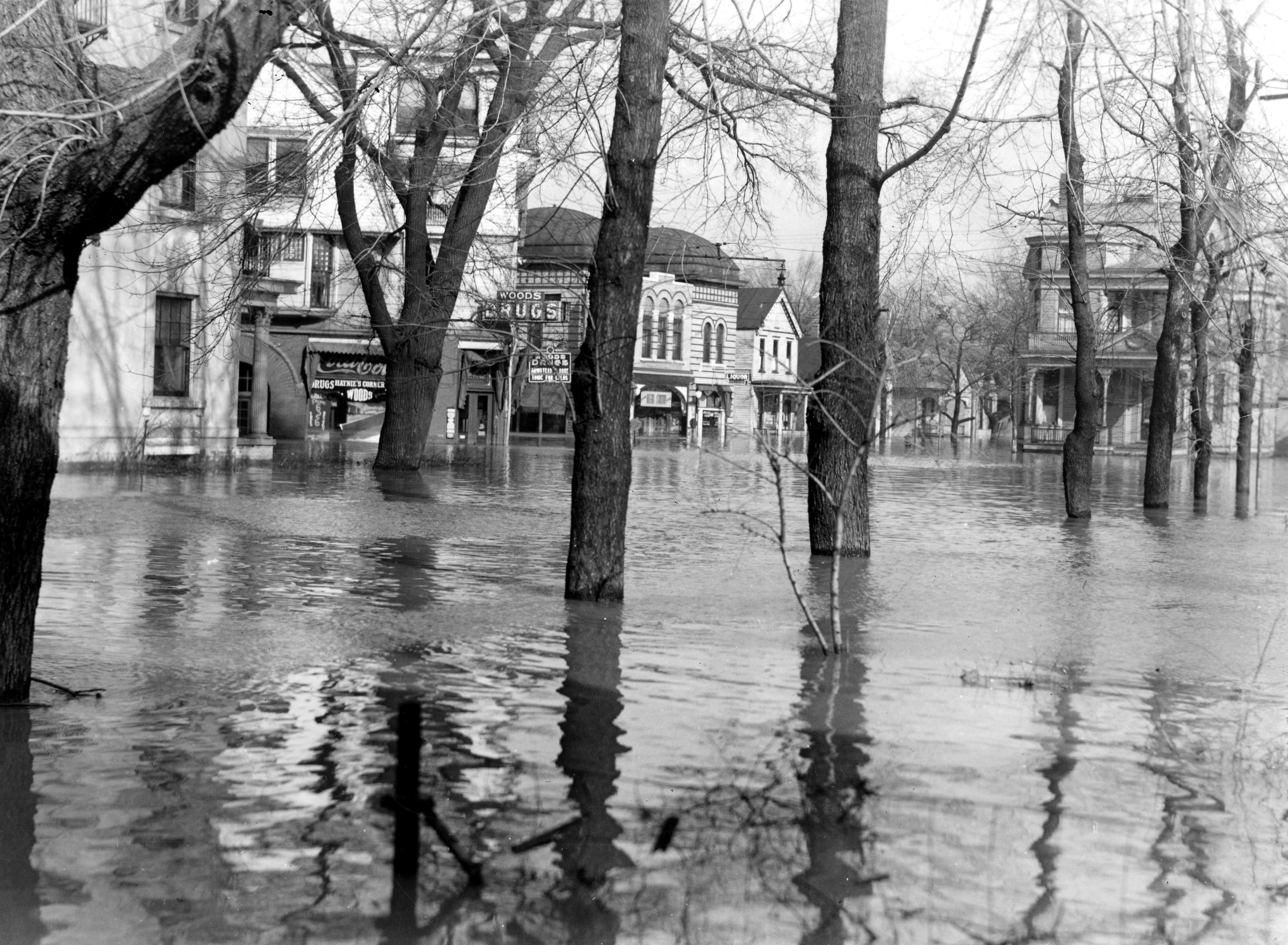 Woods Drug Store at 1022 SE 2nd St. and Alhambra Theatre at 52 Adams Ave., as taken from the porch of the Karl K. Knecht residence at 31 Adams Ave.