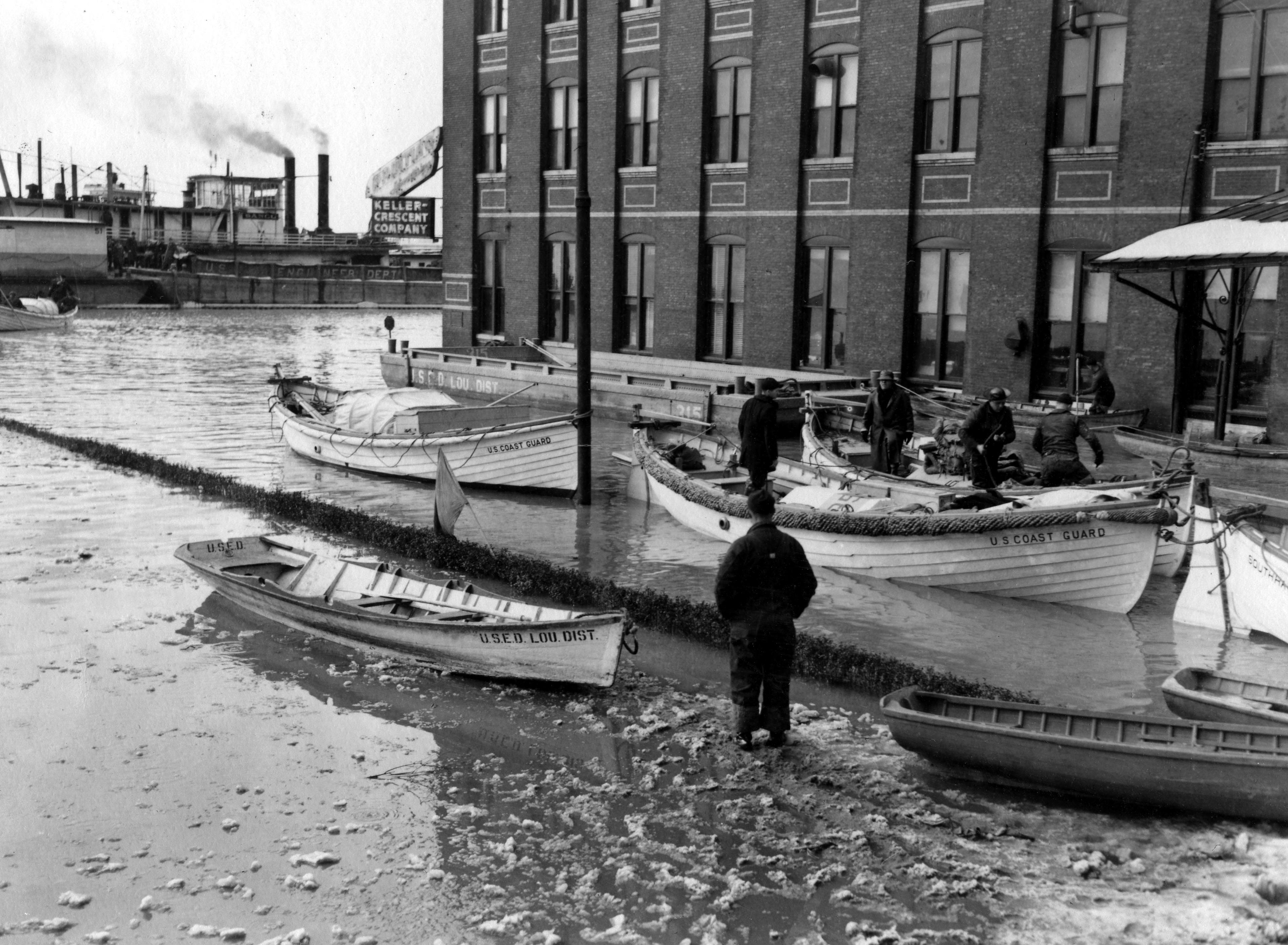 Loading U.S. Coast Guard cutters from dock on Locust St. side of Keller Crescent Printing & Engraving Co. at 24-28 SE Riverside Dr. Barge on river in front from the U.S. Engineer Dept.