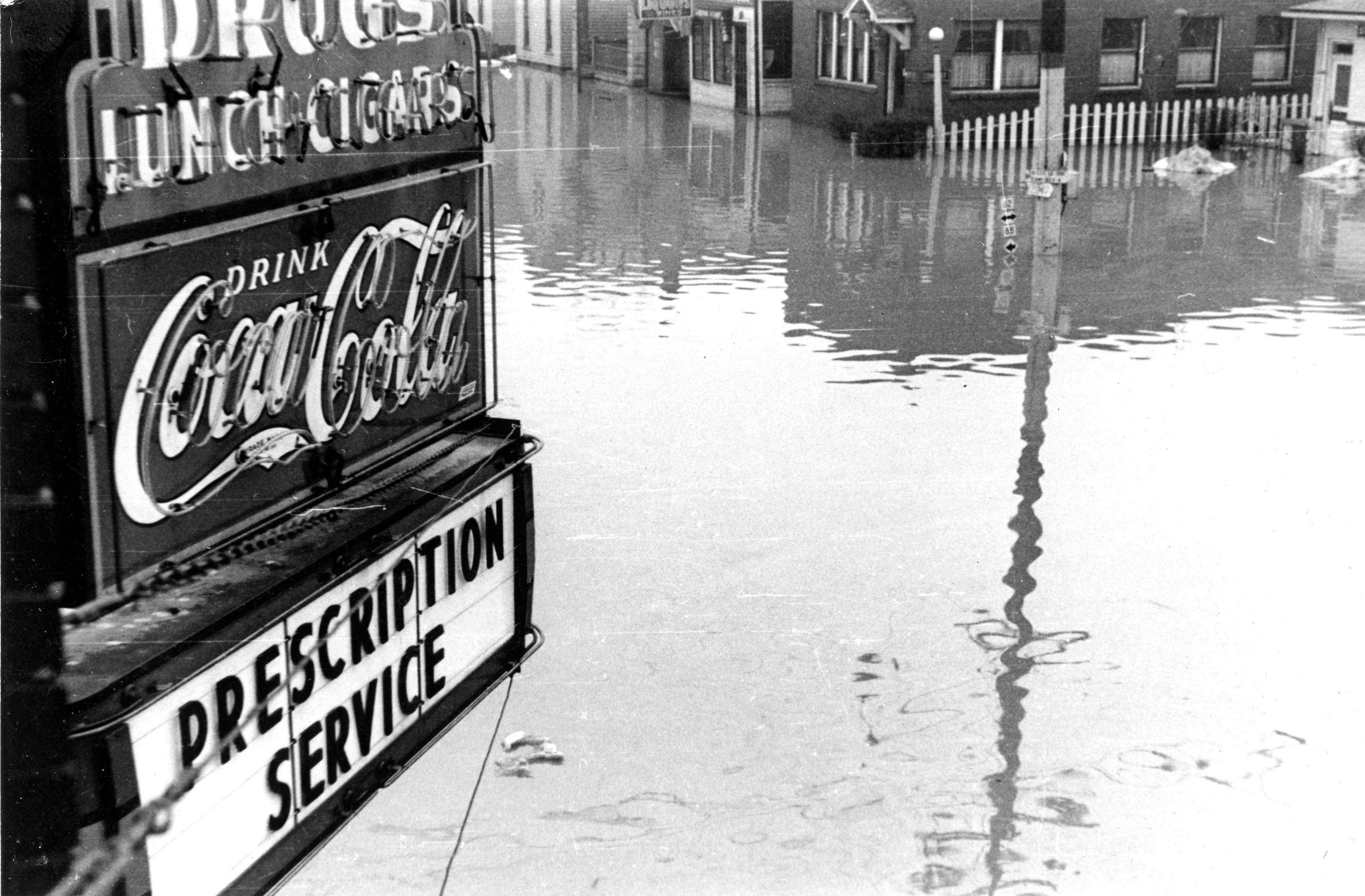 Sign in close-up foreground is for Franklin Drug Store at 2339-41 W. Franklin St. Seen diagonally from this are Ashby Liquors at 212 N. St. Joseph Ave., dental offices (Drs. E. Ray Wesner, Albert F. Corns, and Shelby F. Groves) at 214 N. St. Joseph Ave., Standard Service station at 2400 W. Franklin St.