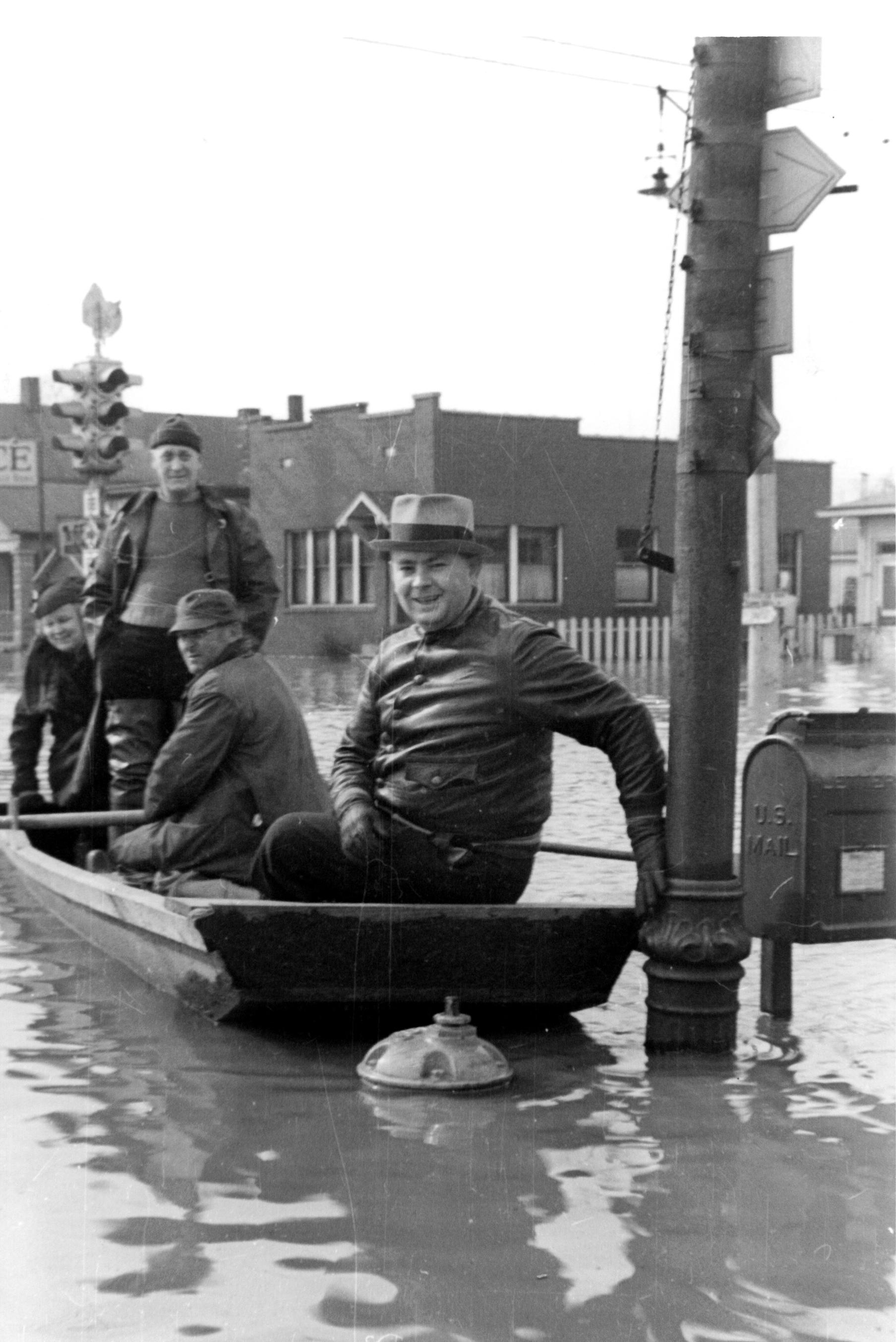 Closer view of three men and one woman in rowboat on N. St. Joseph Ave. near intersection with W. Franklin Street in Evansville, Indiana, just past a traffic light, cross street unidentified. Boat has stopped by a utility pole and a mailbox. Ashby Liquors at 212 N. St. Joseph Ave. is building with ICE sign (just barely visible).