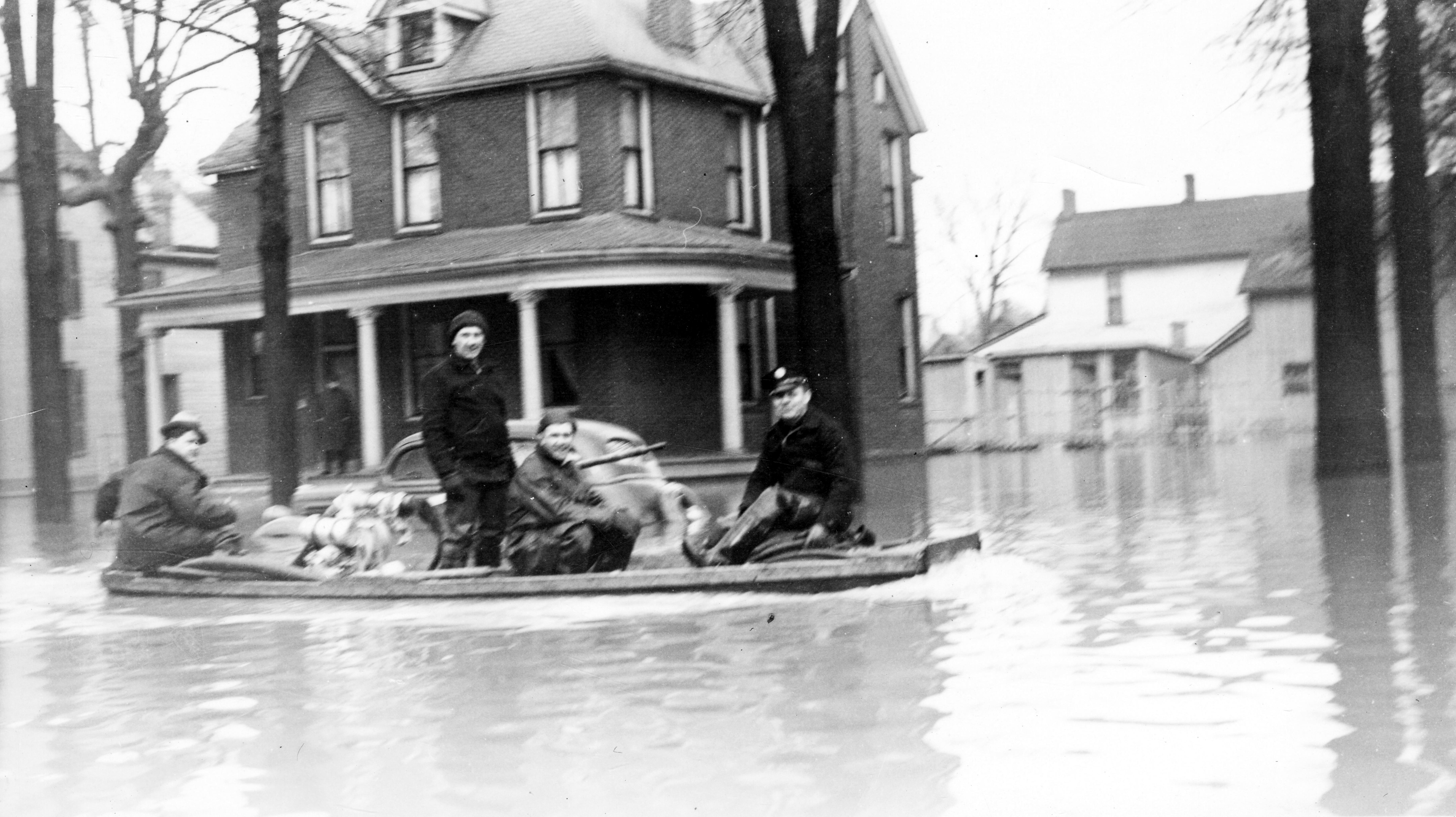 Four men in motorboat, carrying a pump, next to a flooded car in front of a brick house with man standing on porch. Probably Washington Ave. (Same house as 0448)