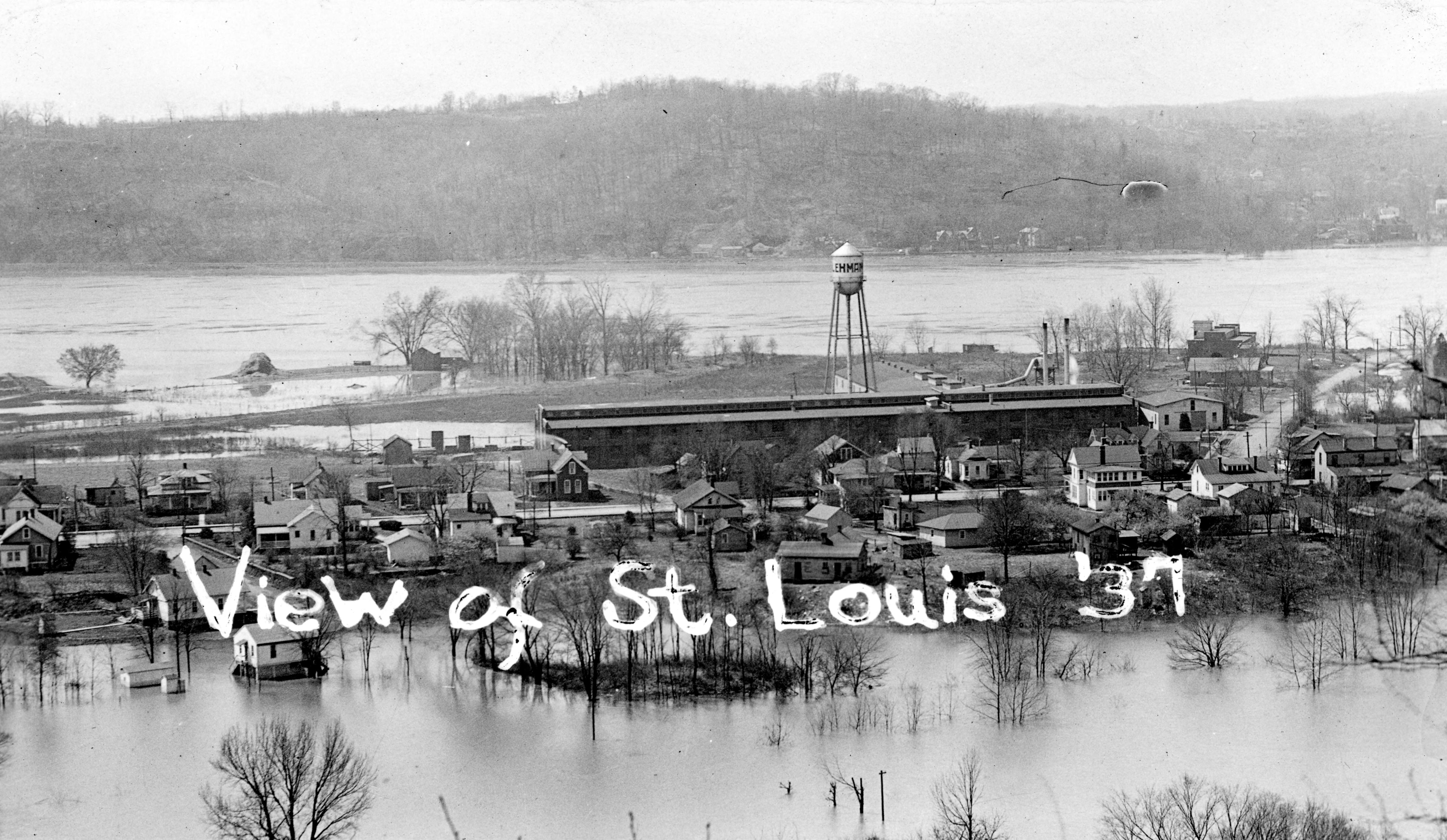 View of St. Louis Ave., taken from above, with Lehman Manufacturing Co. at 1405 4th St. water tower in background