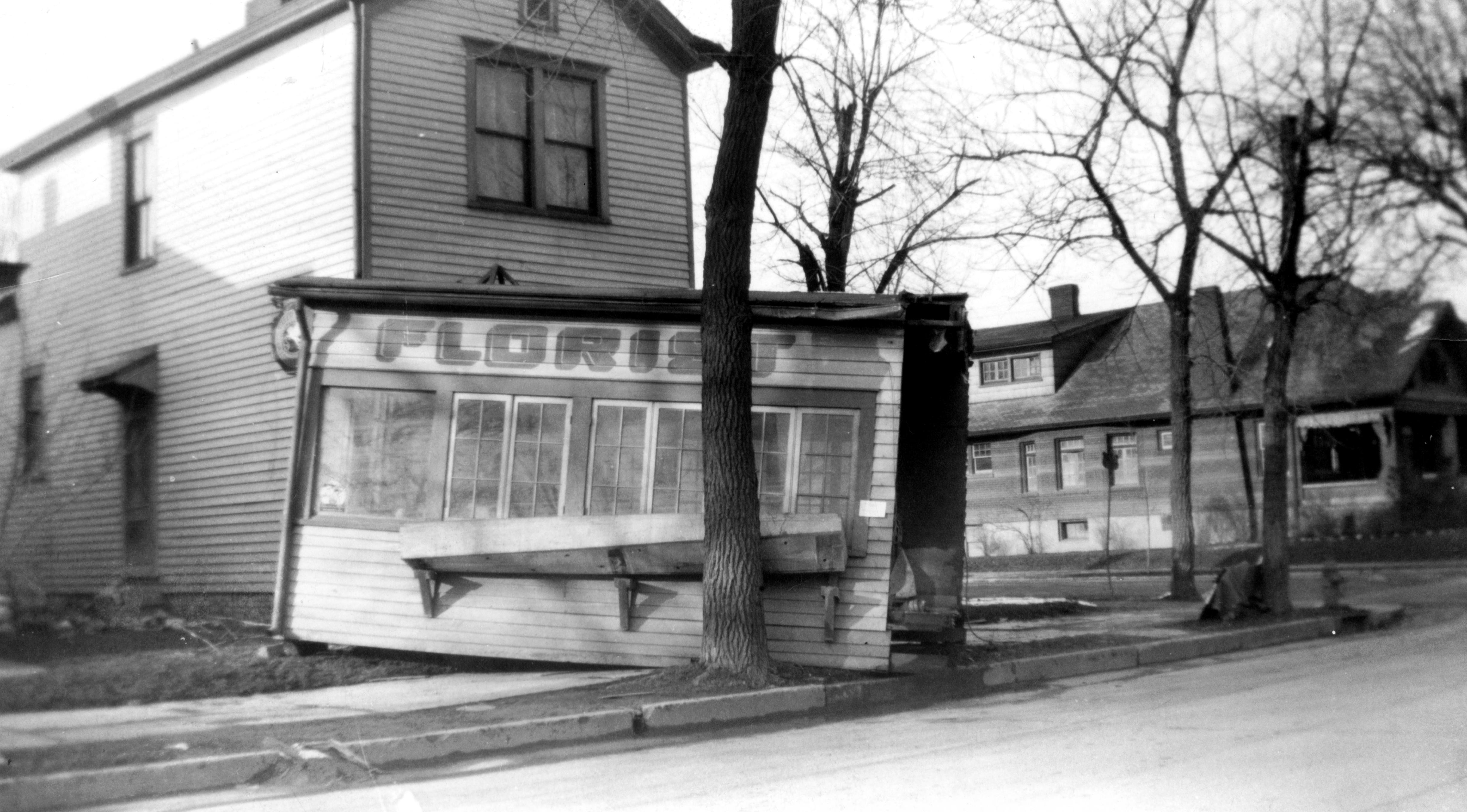 Florist shop building completely removed from its foundation and redeposited in front of residence.
