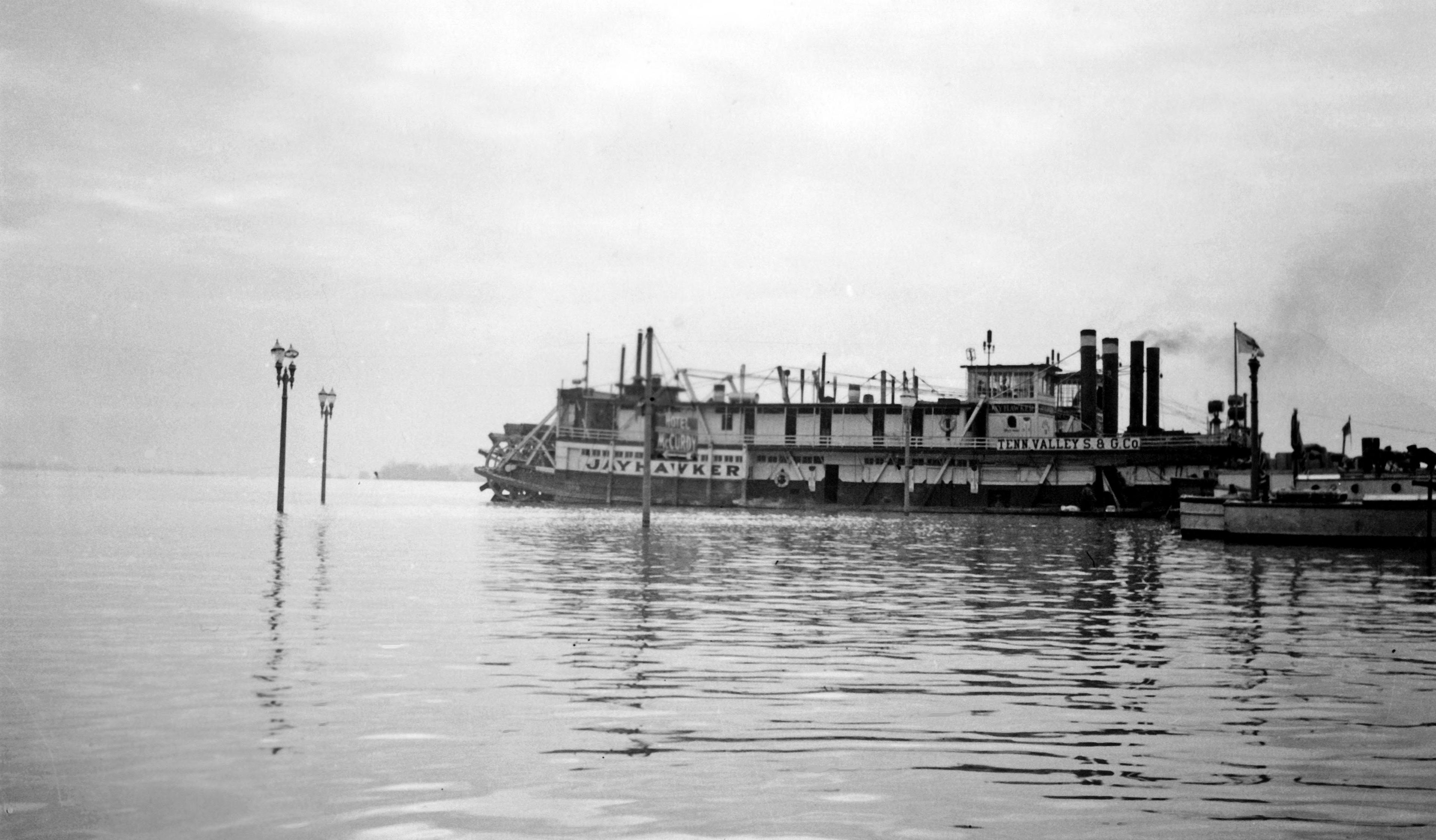 Paddle wheeler the Jayhawker, owned (?)/operated(?) by the Tenn. Valley S & O Co. off Dress Plaza and SE Riverside Dr., roughly in front of the Hotel McCurdy.