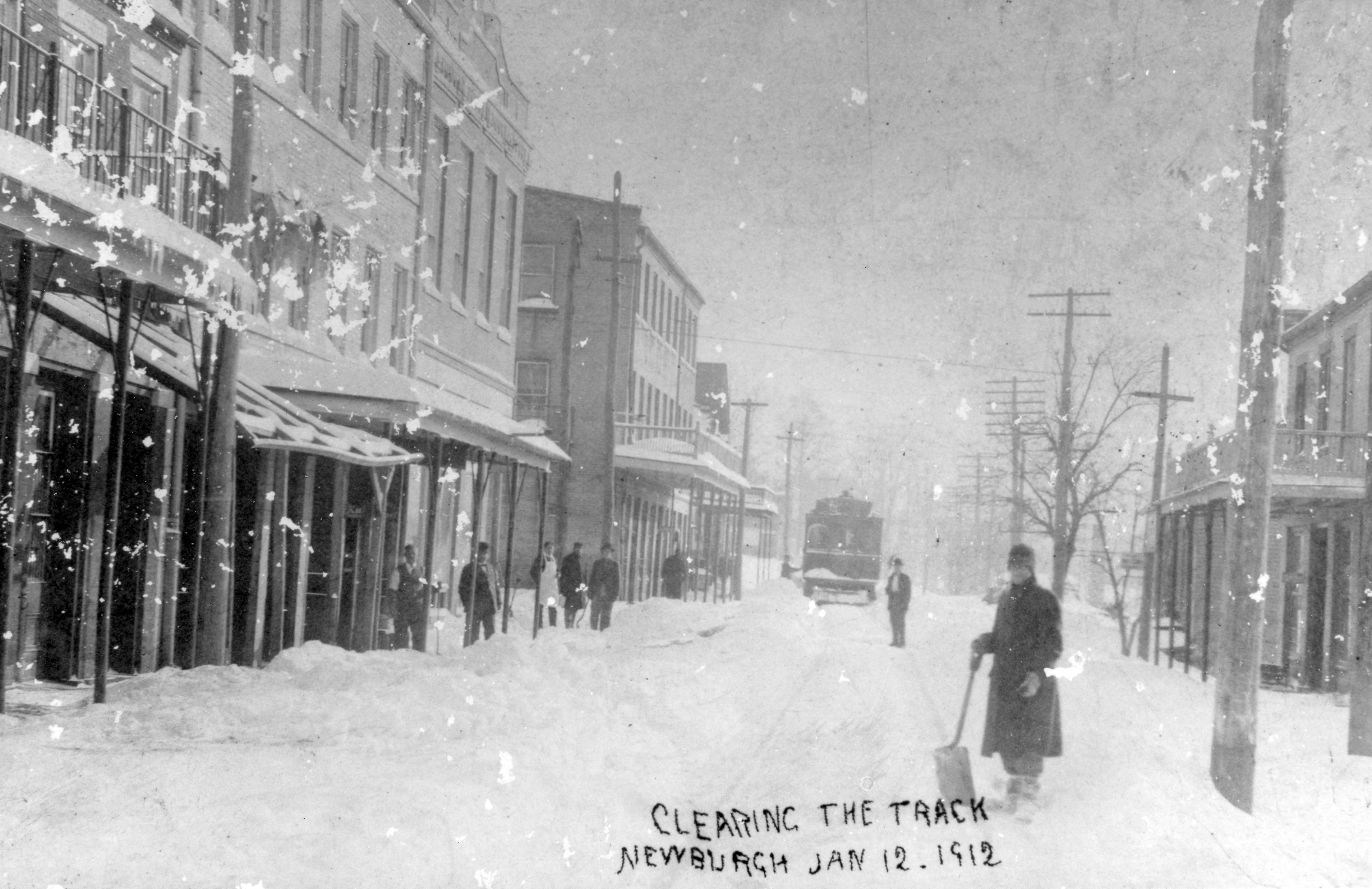 Person shoveling snow off the street and a group of people standing outside a building on the sidewalk watching, with a streetcar on the tracks. Handwritten are the words, Clearing the Track, January 12, 1912.