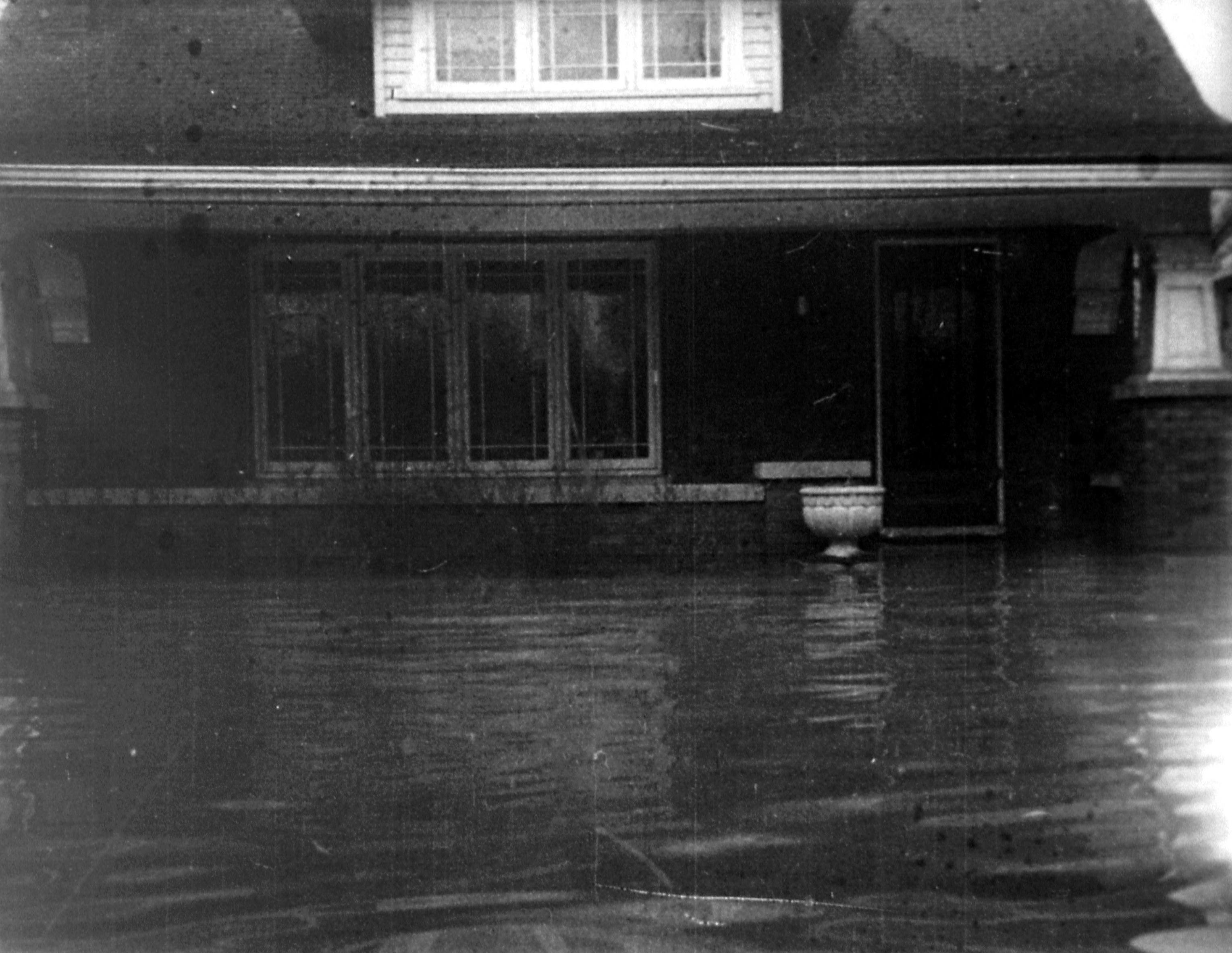 Flooded brick house with dormer window and plant container, water over porch. (Same house as one in 0390, 0391, 0394.)