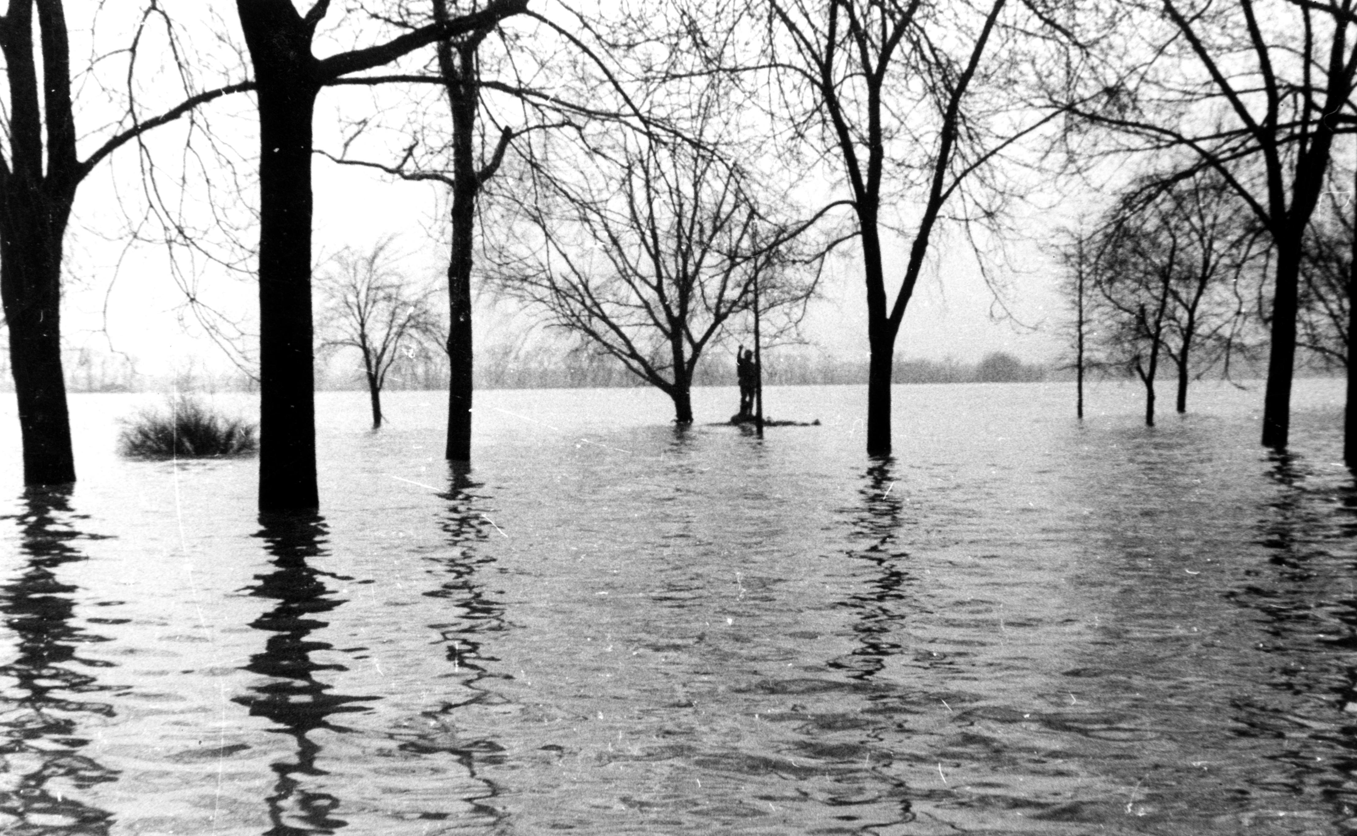 Flooded area with only trees and tops of shrubs. Person standing on bit of dry ground around what might be a light post, with hand raised.