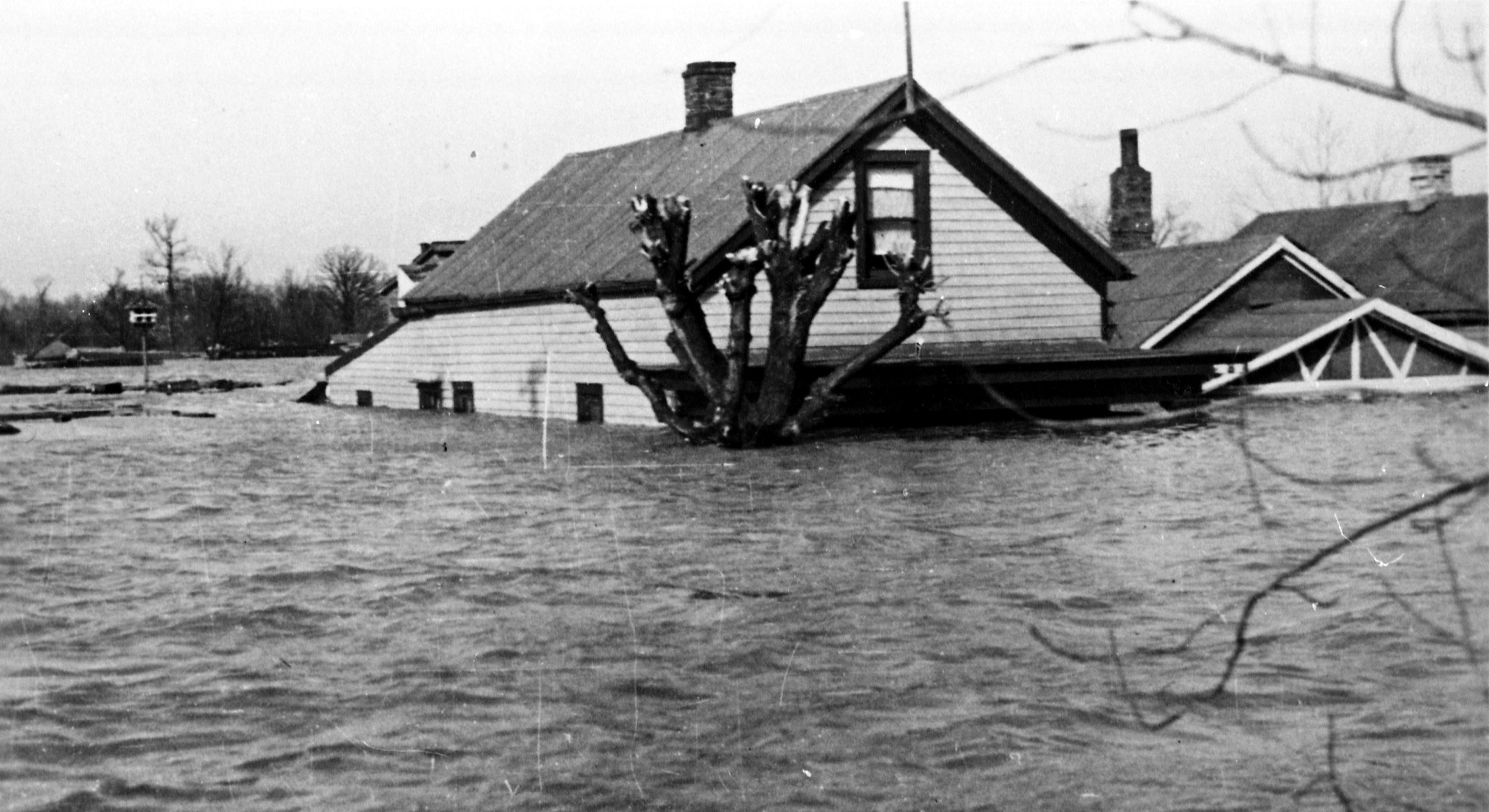 Flooded residences (up to the eaves of shorter houses) A duplicate photo in another collection identified this as the Blankenburg neighborhood. Blankenburg was an area just north of Evansville when the city limits extended to where the Belt RR now is. It was described as a blue collar neighborhood and probably developed when Unity Coal Mines were founded in the early- to mid-1870s. When the Belt RR and P D & E RR were built in 1881, they intersected near the area which helped foster its growth. Meanwhile, Lamasco extended north along Fulton Ave using 21st - 28th streets. Most of these streets were later joined to the existing Blankenburg streets which explains the jogs along Fifth Ave. The Blankenburg area was annexed c1888. (http://historicevansville.com/blankenburg.php) The water here came from nearby Pigeon Creek, as water from the Ohio River flood backed up the creek.