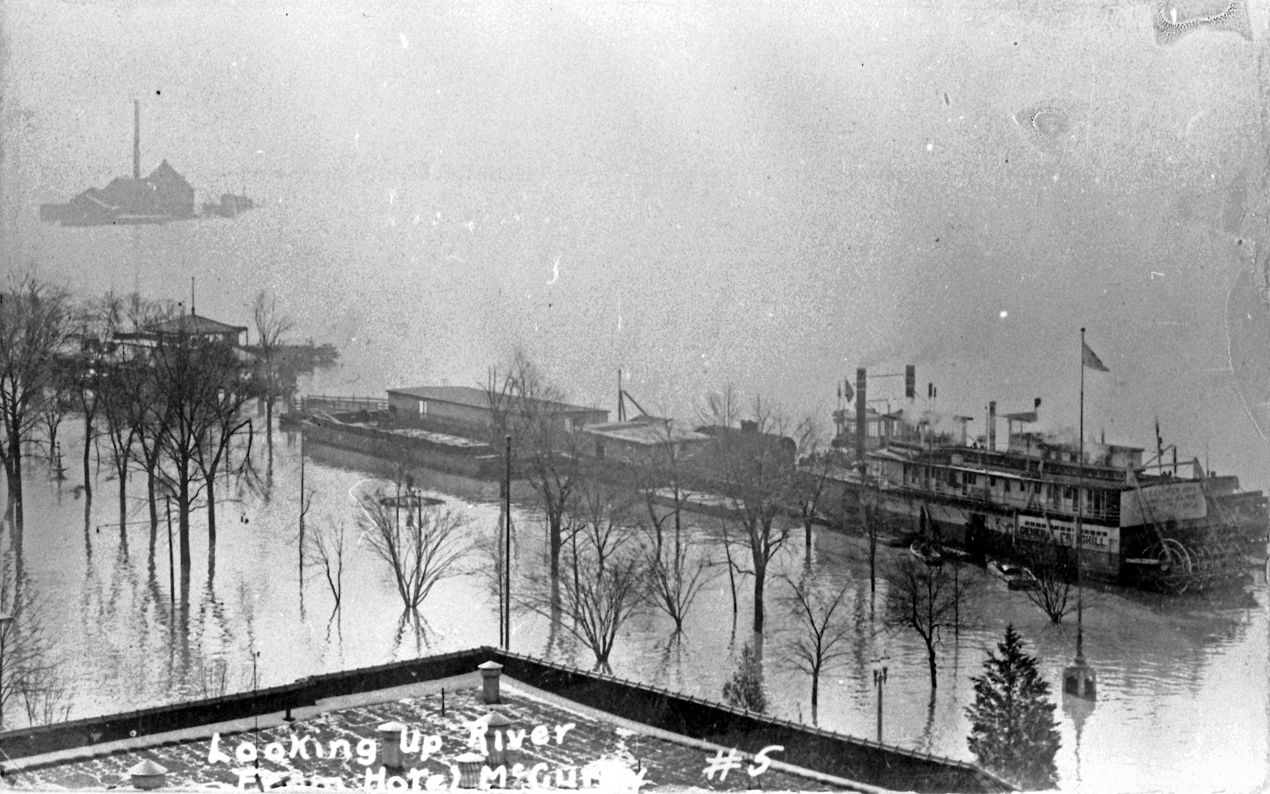 Looking east, or up river, from roof of Hotel McCurdy at 101-11 SE 1st Street. Barge pushed by paddle wheeler in front; Sunset Park shelter house (current Pagoda Visitor's Center) possibly in front of barge, with possibly water treatment plant further upriver.