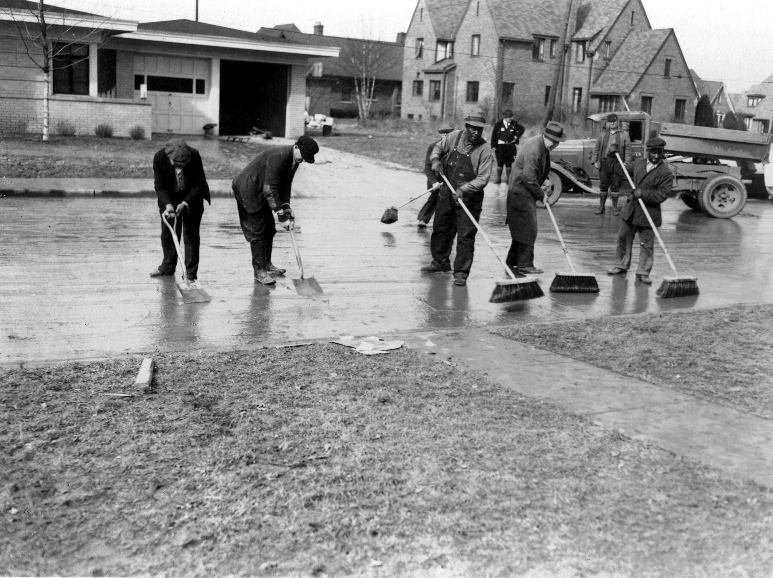 Men shoveling and sweeping street clean on unidentified residential block of Lodge Ave.