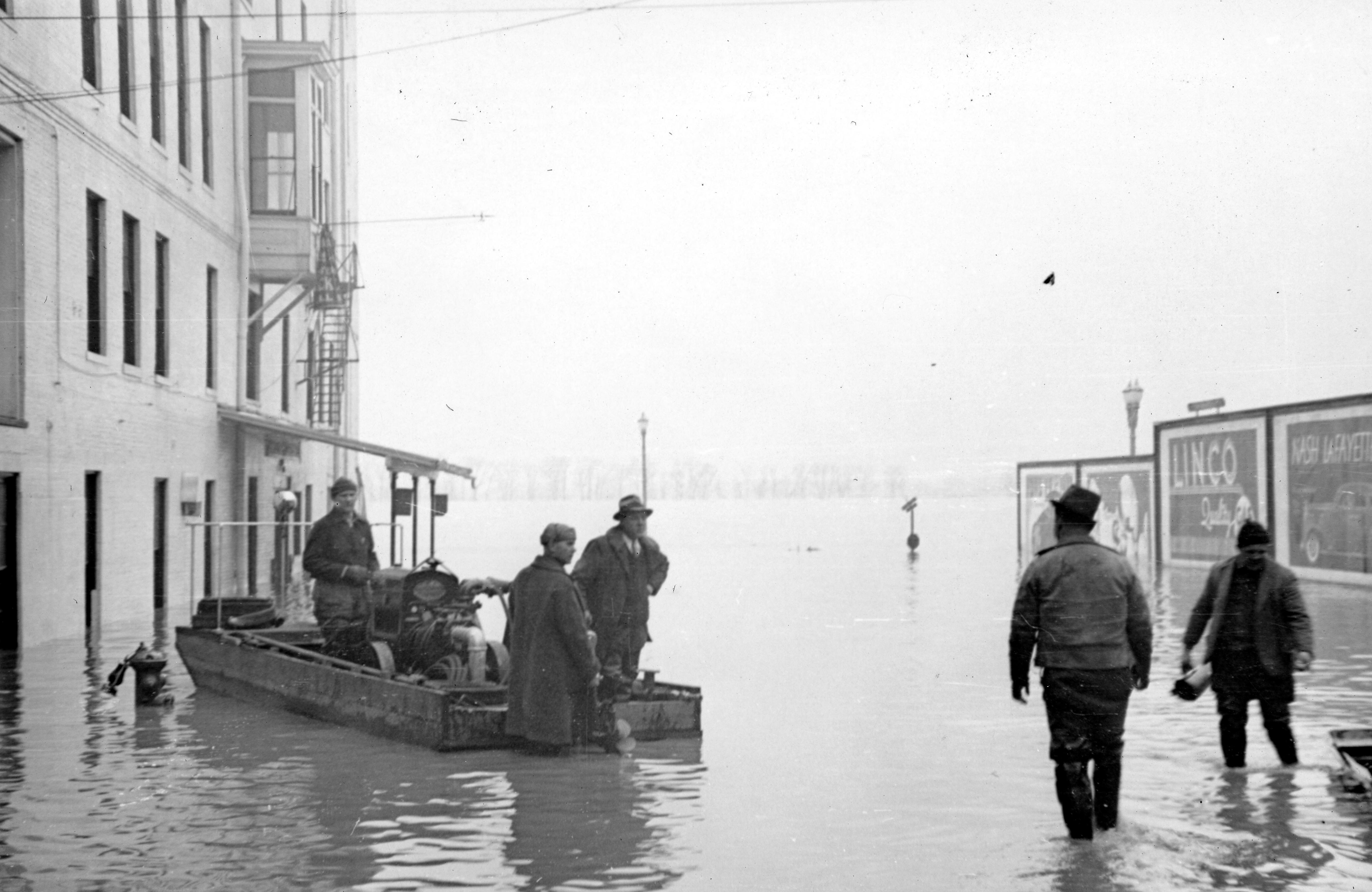 Boetticher and Kellogg Co at 1-15 Fulton Ave. (corner with NW Riverside Dr.) with 2 men in boat and 3 standing in water nearby. Boat might have a pump (?) in it.