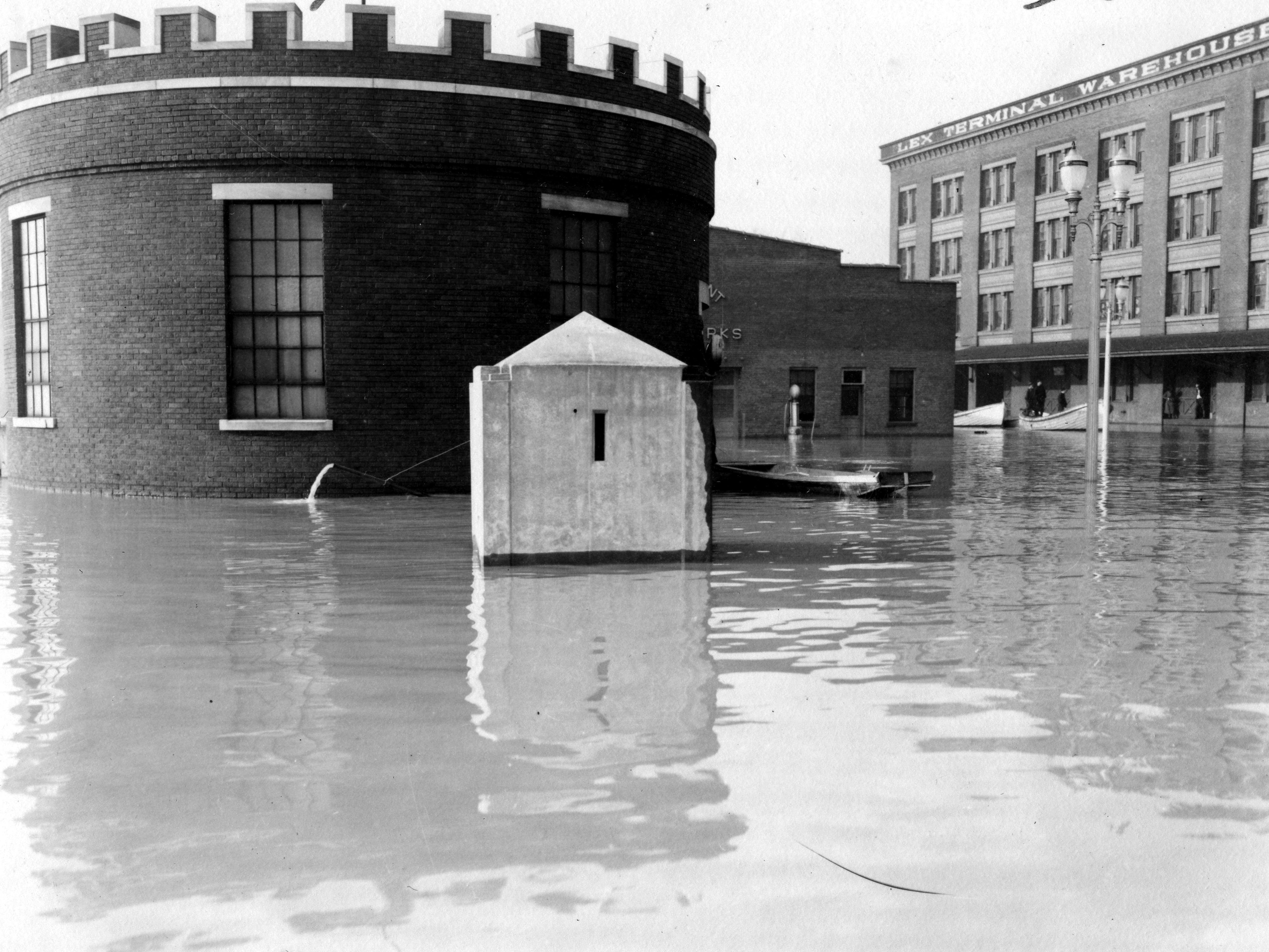 Southern Indiana Gas & Electric Co. pump house on southwest corner of NW Riverside Dr. and Court and Ingle St.. Lex Terminal Warehouse at 2 Ingle St. on right.