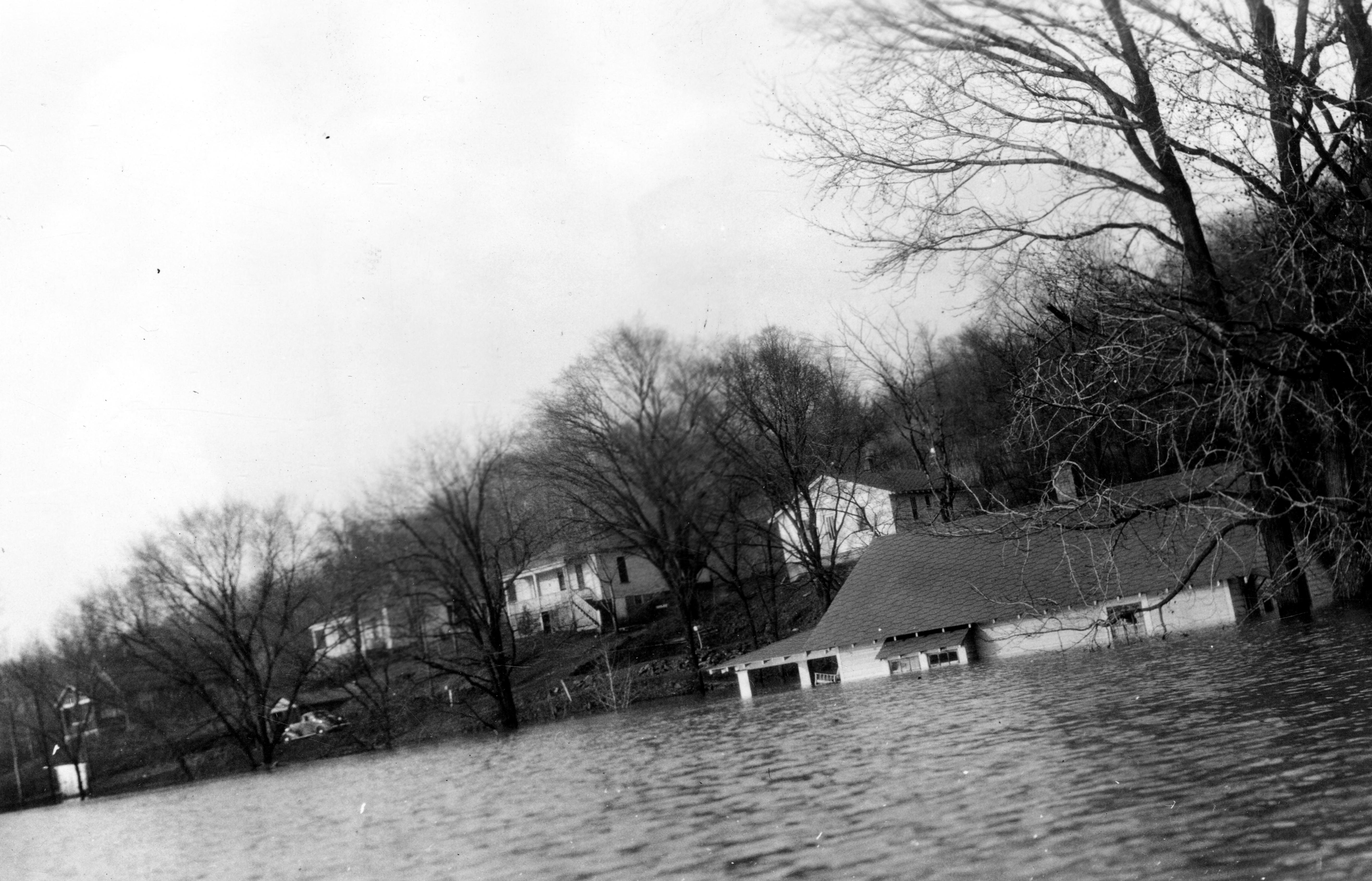 One house submerged up to just below the eaves, with car on dry road and unaffected houses on a rise just beyond. Swing on porch of house in water is floating.