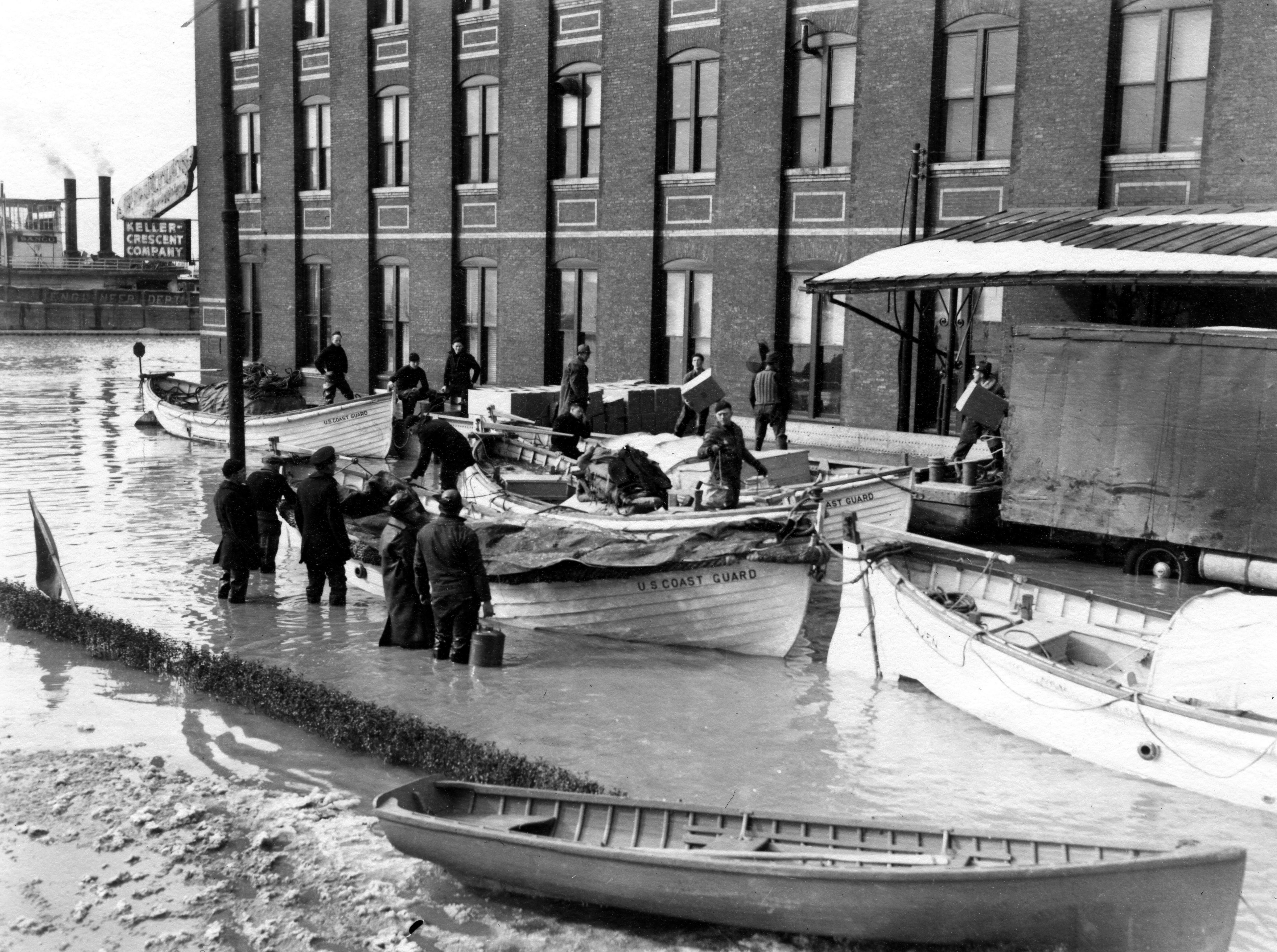 Loading U.S. Coast Guard cutters from dock on Locust St. side of Keller Crescent Printing & Engraving Co. at 24-28 SE Riverside Dr. Barge on river in front from the U.S. Engineer Dept.