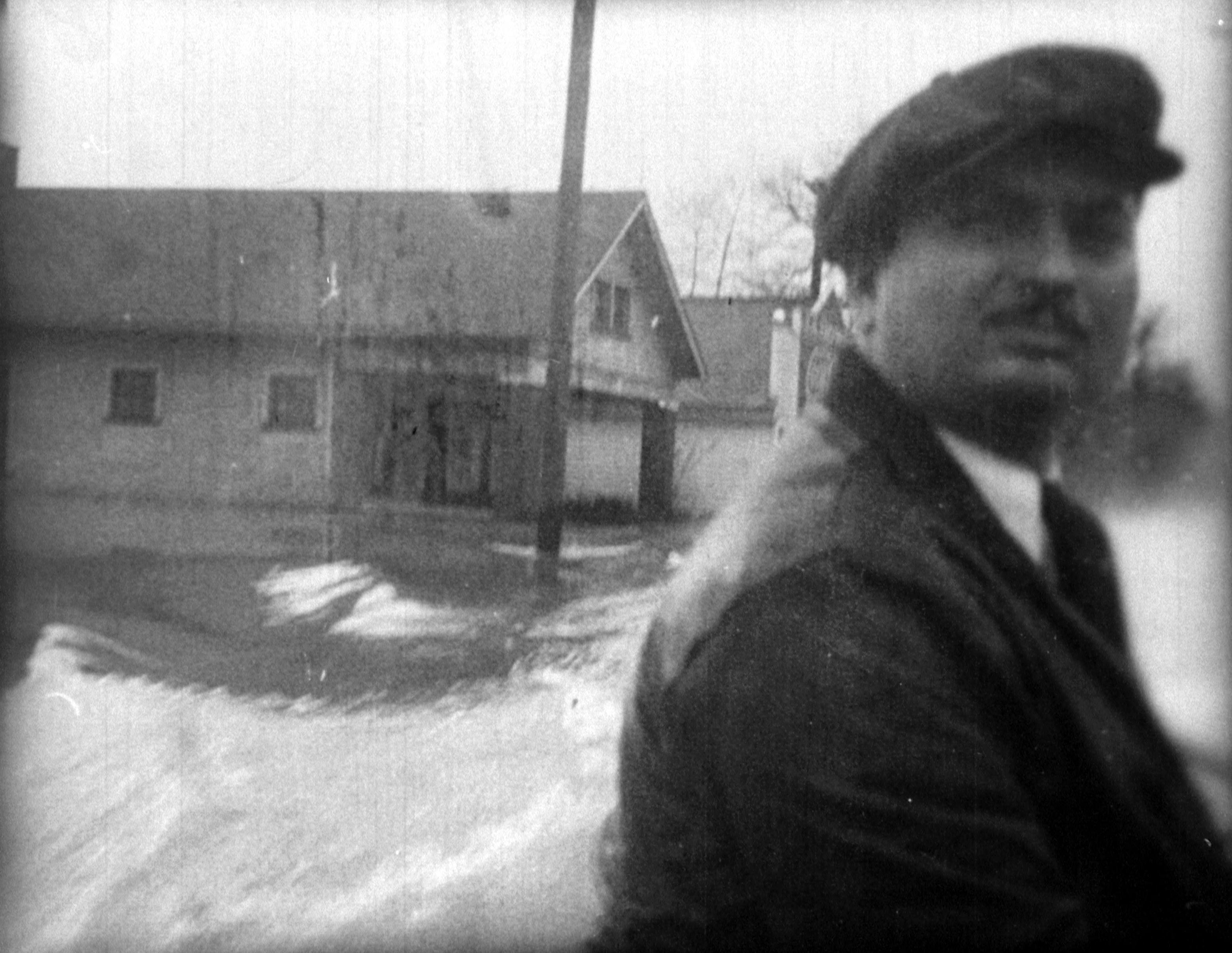 Close-up of man with tie sitting in boat in front of flooded house. Water over porch. Building to right may be a business as it appears to have advertising on the front.