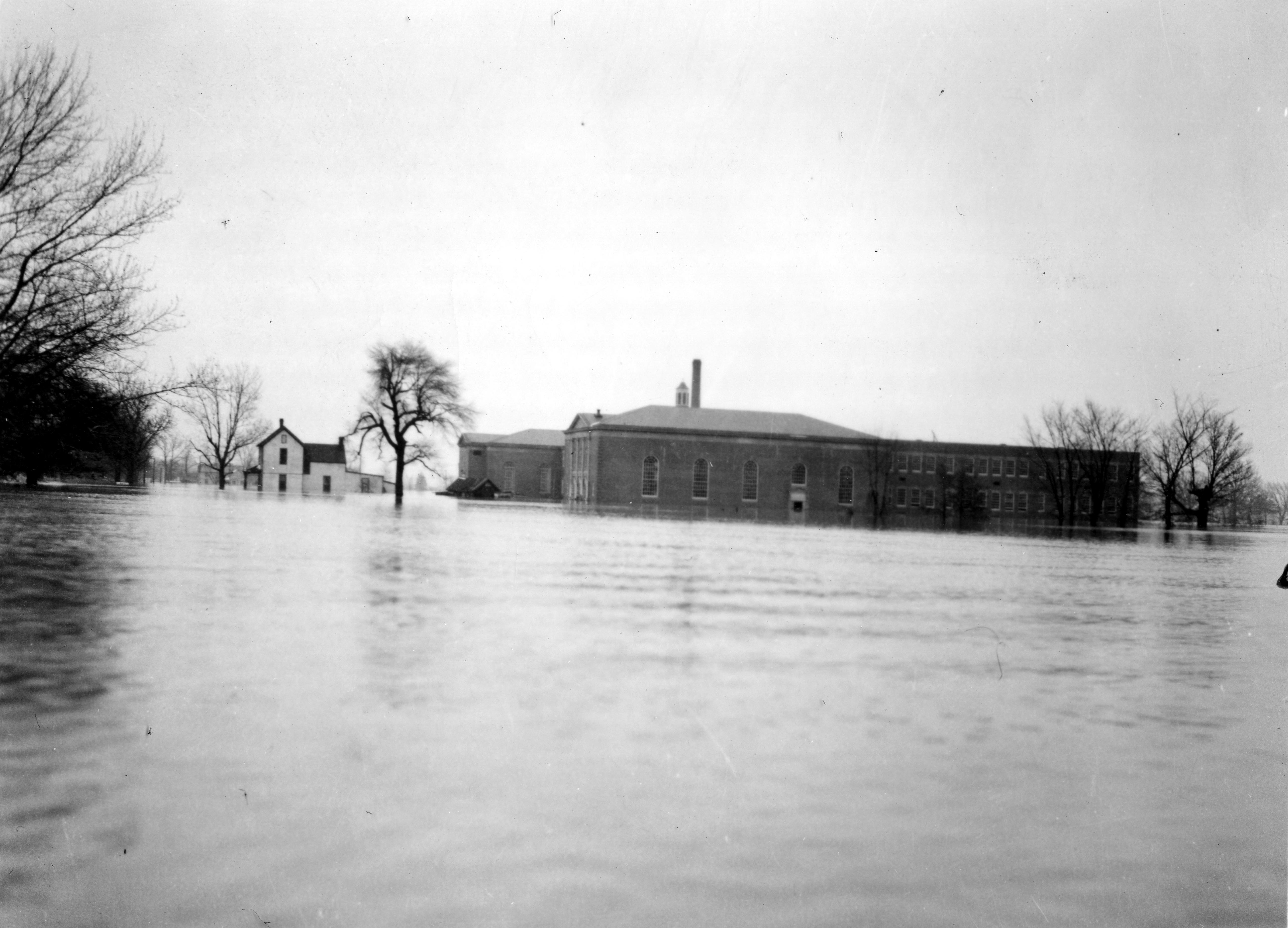 Side view of Washington School at 1600 Washington Avenue, taken from across an expanse of flooding